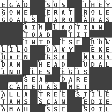 ACROSS 1. Mild oath 5. Mayday 8. Those people 12. Went 13. Part of Q.E.F. 15. Hero or heavy, e.g. 16. Finish lines 18. Edible starchy tuberous root 19. Ancient river in northeast Turkey 20. Direct toward a target or goal 22. Of or relating to Laos or its people 24. Frog relative 26. Teat (slang) 27. To the inside or interior of 28. Compass dir. 29. Ribbon knot 32. _ and Stitch 35. _ Jones' Locker 37. Supplement with great effort 38. Baking chamber 39. Girls' org. (abbr.) 40. Hindu Mythology: god of death 41. Daniel's nick name 42. Froth on beer 43. Freehold land 44. Indiana (abbr.) 45. French article 46. The front part of a cuirass 49. Ocean 50. Have the gumption 51. Devices for capturing images 55. Fish or hair follower 56. Silent film actress Nazimova 57. Family _ (genealogy) 59. Vertical member of a panel or frame 63. Scottish caps 64. Examine minutely or intensely 65. Singer Brickell 66. Nanny 67. Compass dir. 68. Land DOWN 1. Oval reproductive body of a fowl 2. Thick or sticky substance 3. Santa ___, CA 4. Conveyance 5. Arrange properly for use 6. Taken by mouth 7. "Two Mules for Sister ____" 8. Distinguishing feature 9. Israeli folk dance 10. Style 11. It is so 14. A girl or young woman (variant) 17. The Jewish people; Israel 21. Floor covering 23. Make a knot 25. Evades 28. Dodged 29. Necklace unit 30. Gumbo ingredient 31. Welt 32. Farming town in central California 33. "Terrible" tsar 34. Grant temporary use of 36. White ___ sheet 40. French bagpipes 42. Centers of feelings and intuitions 45. Area sheltered from the wind 47. Separate the seeds from cotton 48. Angers 49. Box-office sellout 51. Dollar (slang) 52. _ mater 53. Arches 54. Oceans 56. "One Day ___ Time" 58. Compass dir. 60. Wedding promise 61. Cards in a Roman deck? 62. Snakelike fish