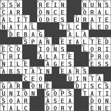 ACROSS 1. Compass dir. 4. It's straight from the horse's mouth 8. Religious women 12. Automobile 13. At one time in the past 14. Of the mouth 15. Set down 17. Lyric poems 18. A salt of uric acid 19. Relating to or accompanying birth 21. Affectionate concern, for short 23. Directed 24. Debunk (Brit. slang) 26. Insect wing 28. Connect, as a bridge 30. Glorified 34. Environmental prefix 37. Charged particles 39. Australian parrot (variant) 40. Three (prefix) 41. Having winglike extensions 43. Adept person 44. "Death on the ____" 46. Ripens 47. Curvy letter 48. Choose not to consume 51. Hearing organs 54. Corporate head (abbr.) 55. National forest in Provo, Utah 58. Slender fish 61. Single 63. Plates 65. The state of being joined or united 67. Republicans 71. Jacques of French films 72. Fly high 73. Toward the sea 74. Spanish title 75. Baby powder 76. Dinghy 77. Compass dir. DOWN 1. Examine minutely or intensely 2. Vegetable dish 3. Compose 4. Friend of Pooh 5. Conclusion 6. Frozen water 7. A home for chicks 8. Not either 9. Mountain range 10. Nathan's nickname 11. Downhill vehicle 16. Bar bills 18. Southern CA. univ. 20. Pet locale 22. Not strict 25. Greek goddess of the earth (variant) 27. 100% 29. Pitcher Ryan 30. First name in cosmetics 31. Drink excessively 32. Blunders 33. "Vaya con ____" 34. Inactive volcano in Sicily 35. Baby bed with high sides 36. Lubricates 38. Tired old horse 42. He sold his birthright 45. And so on (abbr.) 49. A really long time 50. Electrically charged atom 52. To free from 53. In a ____ (agitated or irritated) 56. Sadhe (variant) 57. NE Massachussets city 58. Abrupt rush of wind 59. Small Philippine buffalo 60. Monetary unit of Yemen 62. Mild oath 64. Trig term 66. The grampus (Milton) 68. Bear (Spanish) 69. For each 70. Declare