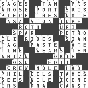 ACROSS 1. Gurus 6. Scottish cap 9. Personal Computers (abbr.) 12. Came up 13. Left side of a ship or aircraft 14. Indian titles of respect 15. Part 16. Angers 17. Brief written record 18. White ___ sheet 19. Portico 20. Drink excessively 21. Writer of Portnoy's Complaint (1969) 23. RI univ. 24. Practice fight 25. Stone: prefix 28. Connecticut Ivy Leaguer 30. Amusement-park features 34. Thailand, formerly 35. Label 36. Thick mixture 38. Had dinner 39. Prong on a fork 41. Erodes 43. Nine, plus one 44. Believer in; advocate of (suffix) 46. Migrant worker of the '30s 48. Bear (Spanish) 49. Prepare for publication 50. Ship's personnel 51. Undercover agent 53. Possessed 56. Silvers or Donahue 57. Snakelike fish 58. Makes less strong or intense 60. Perceives with the eye 61. "Death on the ____" 62. Ancient Celtic tribe of eastern Britain 63. Big collection agency 64. Heredity factor (abbr.) 65. 2nd pers. sing. pres. of can (arch.) DOWN 1. Plant excrement 2. Operatic vocal solo 3. Leaves 4. Fortification 5. Perceive with the eye 6. "Corrida" creature 7. Type of rug 8. Mountains (abbr.) 9. Appease 10. Quote 11. Compass dir. 13. Essential or central part 14. Sounds asleep 19. Long narrow piece of something 20. Uncastrated adult male sheep 22. Boat paddle 24. Seigniories (variant) 26. Pace 27. Presage 28. Singer James 29. Den 31. Fool 32. Compass dir. 33. R.R. building 37. Wear away 40. Artist's stands 42. What Jean-Claude Killy likes to do 45. Immediately 47. New York city 49. Otherwise 50. "Mermaids" star 51. Chow _ 52. Rounded earthenware pot or jar 54. So be it 55. Lairs 56. 23rd letter of the Greek alphabet 57. Conclusion 58. Nervous spasm 59. Be seated