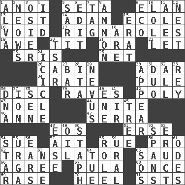 ACROSS 1. Mine, in Marseilles 5. Bristle 9. Liveliness 13. For fear that 14. First man 15. Learning spot: Fr. 16. Null 17. Frustrating wastes of time 19. Deep reverence 20. Teat (slang) 21. Mouth or opening 22. Allow 23. Indian titles of respect 25. Fish or hair follower 26. Apartment or room in a ship 30. The sixth month of the Jewish calendar 34. Feeling or showing extreme anger 35. Whimper 36. Flat circle 39. All-night dance parties 42. Much (prefix) 43. Christmas carol 44. Join together 46. Singer Murray 47. Spanish missionary in California 48. Greek goddess of the dawn 51. Celtic language 54. Institute legal proceedings 57. Small island 58. Sorrow 60. Adept person 62. Interpreter 65. Saudi Arabian king (1953-1964) 66. Match 67. Monetary unit of Botswana 68. At one time in the past 69. Raze (variant) 70. Person who is morally reprehensible 71. Fast planes DOWN 1. Inventor's middle name 2. Catcalls? 3. Flexible twig of a willow tree 4. It would 5. Indian skirt 6. Prepare for publication 7. Label 8. ID or VA city 9. Environmental prefix 10. Hang loosely or laxly 11. Toward shelter 12. Egg locale 15. Part of Q.E.F. 18. "We ___ not amused" (Victoria) 20. Russian ruler of old 24. Ice on the eave 27. Soap unit 28. Call ___ day 29. Congenital growth or mark on the skin 30. Seem 31. Superhero pair 32. 100% 33. Marina Del _, California 36. Heredity factor (abbr.) 37. Electrically charged atom 38. Elected rep. 40. Compass dir. 41. Title for a knight 45. Family _ (genealogy) 48. Relaxation 49. Petroleum 50. Staphylococcus 52. Connects, as a bridge 53. Spew [out] 54. Play the lead 55. Capital and largest city of Mongolia 56. Hearing organs 58. Hero or heavy, e.g. 59. Mountain range 61. Lyric poems 63. Born 64. Third day of the wk. 65. Distress signal