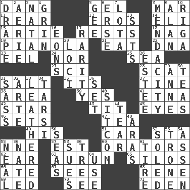 ACROSS 1. Mild oath, euphamism for damn 5. Set 8. Make imperfect 11. Tail end 12. Greek god of love 14. Biblical high priest 15. Nick name for Arthur 17. Musical pauses 18. Tired old horse 19. Player piano 21. Ingest 22. Heredity factor (abbr.) 23. Snakelike fish 24. Not either 25. Ocean 27. _-fi 28. Get outta here! 31. Table seasoning 35. ___ a Wonderful Life 37. Prong on a fork 38. Type of rug 39. It is so 41. Inactive volcano in Sicily 42. Play the lead 43. Teat (slang) 45. Sight organs 46. Puts into a specified state 47. Beverage made from leaves 49. Part of HMS, perhaps 51. Auto 52. R.R. building 55. Compass dir. 57. Eastern Standard Time (abbr.) 60. Speakers 62. Ewer handle 63. Gold (Symbol: Au) 65. Grain storage towers 66. Had dinner 67. Perceives with the eye 68. French philosopher Descartes 69. Directed 70. Observe 71. Genesis locale DOWN 1. Window treatment 2. Nest on high 3. Brizilian seaport 4. Amused look 5. Turn to the right 6. Celtic language 7. Globular water bottle used in Asia 8. Ananias' fault 9. ____ Jay Lerner 10. Port city in Latvia 13. Fast planes 16. Immeasurably long periods of time 17. Noteworthy scarcity 20. Locales 26. First name in cosmetics 29. Singer Murray 30. Beverages made from leaves 31. Backtalk 32. Johnson of "Laugh-In" 33. Resembling or made to resemble leather 34. Tarsus (plural) 36. Arrange properly for use 40. "Cheers" or "Ellen" 44. Pull apart 48. Ancient river in northeast Turkey 50. Oceans 52. Having a sole or soles 53. Heavy duty weighing machine 54. NE Netherlands city 55. Actress Patricia 56. Nathan's nickname 58. Takes to court 59. Relationship diagram 61. Hoop that covers a wheel 64. Purpose