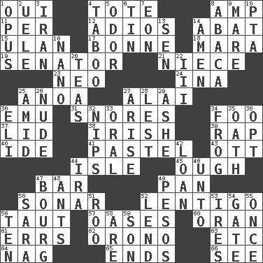 ACROSS 1. Fr. "Yes" 4. Carryall 8. Electrical Unit 11. For each 12. Goodbye (Sp.) 14. Blind as ____ 15. ____ Bator, Mongolia 17. Maid-servant 18. Hindu Mythology: god of death 19. Elected representative 21. Sibling's daughter 23. Modern: prefix 24. _ tizzy (2 wds.) 25. Small Philippine buffalo 27. Mountain range southwest of Kyrgyzstan 30. Australian flightless bird 31. Sounds asleep 34. Egg _ yung 37. Flaplike covering 38. From or relating to Ireland 39. Hit sharply and swiftly 40. Binary compound 41. Soft color 43. Baseball player Mel 44. Small island 45. Ending for "Through" and "Enough" 47. Oblong piece of solid material 49. Baking dish 50. Underwater navigation system 52. Small, flat, pigmented spot on the skin 56. Tense 57. Fertile tracts in a desert 60. Northwest Algerian city 61. Blunders 62. U. of Maine site 63. And so on (abbr.) 64. Tired old horse 65. Conclusions 66. Observe DOWN 1. Musical composition 2. Ubangi River tributary 3. SW Asia republic 4. Off limits 5. Scent 6. Metal container 7. Period of immesurable duration 8. Phillipine bananalike plant 9. Female horse 10. Parent Teacher Association (abbr.) 13. Elected rep. 14. So be it 16. Billionth: prefix 20. Afternoon social gatherings 22. One more than two 25. Among 26. Naked 27. Originate 28. For fear that 29. American tennis player Robert 30. Biblical high priest 32. Pinches, bites 33. Spoken 34. Tree-dwelling hopper 35. Pledge 36. Elect 42. Grant temporary use of 44. Lyricist Gershwin 46. To (old English) 47. French market town 48. Pismires 49. Mexican monetary units 50. "Two Mules for Sister ____" 51. Friend of Pooh 52. Grant temporary use of 53. Angers 54. Yard entry 55. At one time in the past 56. "___ Little Indians" 58. "We ___ not amused" (Victoria) 59. Boy, to dad