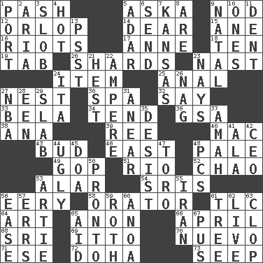 ACROSS 1. Romantic infatuation 5. "____ silly question..." 9. Dreamland 12. Lowest deck of a ship 14. Letter starter 15. One (Scot) 16. Debaucheries 17. Queen of England 1702-14 18. Nine, plus one 19. Keyboard key 20. Broken pieces 23. Political cartoonist Thomas 24. Detail 25. Of or related to the anus 27. Egg locale 30. Health resort 32. Declare 33. Actor Lugosi 34. Be inclined (to) 36. Girls' org. (abbr.) 38. Santa ___, CA 39. To riddle 40. Big _ 43. Partially opened flower 46. 90 degrees 48. Light colored 49. Republican Party 51. River (Sp.) 52. US Secretary of Labor Elaine L. _ 53. Having or resembling wings 54. Indian titles of respect 56. Suggestive of the supernatural 58. Speaker 61. Affectionate concern, for short 64. Nonscientific branch of learning 65. At once, immediately (arch.) 66. Showery time 68. _ Lanka 69. "Tell ____ the Marines!" 70. New (sp.) 71. Compass dir. 72. Capital of the state of Qatar 73. Ooze DOWN 1. Left side of a ship or aircraft 2. Roberta Peters solo 3. Messy guy 4. Being at a high temperature 5. The sixth month of the Jewish calendar 6. Post 7. Sunflower state 8. "We ___ not amused" (Victoria) 9. Brizilian seaport 10. Singles 11. Scratch 13. Inconspicuous attention getter 21. Behest 22. Electrical Unit 23. Negative votes 24. Call ___ day 26. Tired old horse 27. Basketball assoc. 28. Car or cant ending 29. Thick slice 31. Approach 35. Stop 37. Nursemaid 41. According to 42. Corporate head (abbr.) 44. Repulsive 45. ___ good deed 47. "Corrida" creature 48. Personal Computers (abbr.) 50. Right away 53. Nick name for Arthur 55. SW Asia republic 56. Comfort 57. Blunders 59. Writer of Portnoy's Complaint (1969) 60. Small Philippine buffalo 61. Relationship diagram 62. Not recorded 63. Hoof sound 65. Help 67. Fluid product of inflammation