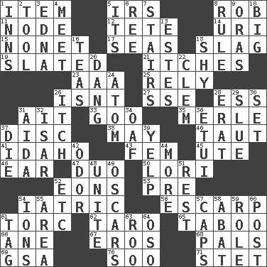 ACROSS 1. Detail 5. Big collection agency 8. Director Reiner 11. Connecting point 12. Wig 14. RI univ. 15. Music written for nine 17. Oceans 18. Volcanic refuse 19. Scheduled 21. Irritating cutaneous sensations 23. American Automobile Association (abbr.) 25. Have trust in 26. Is not 27. Compass dir. 28. Curvy letter 31. Small island 33. Thick or sticky substance 35. Haggard of country music 37. Flat circle 38. Fifth month 40. Strained 41. Potato state 43. Opposite of masc. 45. Shoshoni 46. Ewer handle 47. Superhero pair 50. Australian parrot (variant) 52. Immeasurably long periods of time 53. Before (prefix) 54. Of or pertaining to medicine 56. Fortification 61. Torque (variant) 62. Pacific island yam 65. Off limits 66. A saturated hydrocarbon 67. Greek god of love 68. Friends 69. Girls' org. (abbr.) 70. "Barney Miller" actor Jack 71. Proofreading order DOWN 1. Taverns 2. Instrument 3. Pulitzer Prize-winning author Ferber 4. Rendezvous 5. It is 6. Portuguese money of account (variant) 7. Flight of steps 8. General guideline 9. Mouths or openings 10. Massive 13. _____ Park, CO 16. Beverages made from leaves 18. Like a shrinking violet 20. Mild oath, euphamism for damn 22. Clement's nick name 24. Smallest unit of an element 26. Hankering 28. Part of Q.E.F. 29. Change direction abruptly 30. Put into a specified state 31. Opera by Verdi 32. Austrian river, tributary to the Danube 34. Clumsy lout 36. Needle case 37. Expire 39. Sharp bark 42. Aroma 44. Greater amount 48. Join together 49. Motion picture awards 51. Take ten 52. And so on (abbr.) 54. Charged particles 55. Length times width 57. Smile enhancers 58. Blind as ____ 59. Hero or heavy, e.g. 60. Mail 61. Label 63. Friend of Pooh 64. Bear (Spanish)