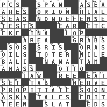 ACROSS 1. Personal Computers (abbr.) 4. Connect, as a bridge 8. Toward the sea 12. Ancient Greek god of war 14. Greek mythologigal hunter 16. Monetary unit of Yemen 17. Oceans 18. Unrelated to defense, as in spending 20. Trials 22. Hearing organ 23. And so on (abbr.) 24. Make supply last 25. _ tizzy (2 wds.) 28. Chop off 30. Type of rug 31. Catches 35. Distress signal 37. Indian titles of respect 40. Mouths or openings 41. Lubricates 42. Carrier 44. "Death on the ____" 45. Indonesian resort city 46. Grandmother 47. Scottish cap 48. Collect or gather 50. "Beetle Bailey" pooch 52. The 23rd letter of the Hebrew alphabet 54. To separate or throw off 55. Erode 58. Put into a specified state 61. Bar bill 63. Effrontery 65. Appease 70. Within a short period 71. "____ silly question..." 72. Lies 73. Prepare for publication 74. Adolescent 75. Narrow board 76. Begley and Asner DOWN 1. Thick mixture 2. Small stream 3. Gospel singer Marvin 4. Male offspring 5. Adept person 6. The 18th letter of the Arabic alphabet 7. Connecting point 8. "We ___ not amused" (Victoria) 9. Trig term 10. 90 degrees 11. Actor Baldwin 13. Fast jet (abbr.) 15. Actress Patricia 19. Tree-dwelling hopper 21. Title for a knight 26. Egg locale 27. Composer Copland 29. Right away 30. Help 32. Roberta Peters solo 33. Lip ointment 34. Compass dir. 35. Thailand, formerly 36. Rounded earthenware pot or jar 38. Call ___ day 39. Sir (Sp.) 41. Chief or king in Benin or Nigeria 43. Assign a rank or rating to 49. Suttee (variant) 51. Nine, plus one 53. Electrical Unit 55. Wear away 56. Prevent from happening 57. Portable shelters 58. Argument over a trivial matter 59. Celtic language 60. Puff or smoke 62. Prejudice 64. Compass dir. 66. Baking dish 67. Everything 68. Afternoon social gathering 69. Eastern Standard Time (abbr.)
