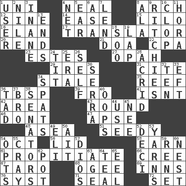 ACROSS 1. University (slang) 4. Anneal 8. Bowlike part 12. Trig term 14. Relaxation 15. _ and Stitch 16. Flair 17. Interpreter 20. Tear apart 21. ___ good deed 22. Numbers guy (abbr.) 23. _____ Park, CO 27. Brightly colored fish 29. Angers 31. Quote 34. Lacking originality or spontaneity 35. Coral ridge 36. Cook's measure (abbr.) 39. From 41. Is not 42. Length times width 43. Unit of ammunition 46. Do not 47. Domed church section 48. At sea 51. Shabby and untidy 54. Sep. follower 56. Flaplike covering 58. Merit 61. Conciliate 66. Algonquian 67. Edible starchy tuberous root 68. Double curve, resembling the letter S 69. Restaurants 70. System (abbr.) 71. Lick closed 72. Arrange properly for use DOWN 1. One who uses or employs something 2. Mediterranean tributary 3. Silly 4. Fish or hair follower 5. Hearing organ 6. White ___ sheet 7. Grant temporary use of 8. Insect wing 9. Actors Guy, Robert Welles, and Clint 10. Hoof sound 11. Israeli folk dance 13. Conclusions 18. "Barney Miller" actor Jack 19. Infant locale 24. Teat (slang) 25. Period 26. Automatic 28. Bitter 30. Spanish missionary in California 32. "___ Little Indians" 33. Newt 34. Arguments over trivial matters 36. Small boy 37. Sis' sibling 38. Elected representatives 40. I made a mistake 44. Purpose 45. Born 49. Biblical high priest 50. Small island 52. Tenth: prefix 53. Tall tales 54. Chooses 55. Supercomputer manufacturer 57. "Vaya con ____" 59. French philosopher Descartes 60. Egg locale 62. Plant holder 63. Mature 64. Afternoon social gathering 65. Snakelike fish