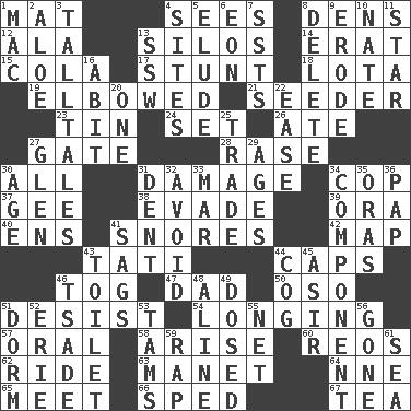 ACROSS 1. Floor covering 4. Observes 8. Habitations of wild animals 12. Wing 13. Grain storage towers 14. Part of Q.E.F. 15. Root beer relative 17. Difficult or unusual or dangerous feat 18. Globular water bottle used in Asia 19. Shoved, as through a crowd 21. Sowing specialist 23. Metal container 24. Put into a specified state 26. Had dinner 27. Yard entry 28. To erase 30. 100% 31. Break 34. Police officer (slang) 37. Turn to the right 38. Elude 39. Mouth or opening 40. Followers of ems 41. Sounds asleep 42. Atlas unit 43. Jacques of French films 44. Balmoral and tarboosh 46. Coat; cloak 47. June honoree 50. Bear (Spanish) 51. Cease 54. Yearning 57. Relating to the mouth 58. Get up 60. Vintage cars 62. Travel on or in a vehicle 63. French painter Edouard 64. Compass dir. 65. Rendezvous 66. Drove too fast 67. Afternoon social gathering DOWN 1. Big _ 2. _ vera 3. Baron Munchausen's specialties 4. Settings 5. Dodge 6. A really long time 7. Fast planes 8. Erase 9. Wear away 10. Nathan's nickname 11. Play the lead 13. Compass dir. 16. "This won't hurt ____!" 20. Single 22. Relaxation 25. Swap 27. Small, secluded valley 29. Ripens 30. Mature 31. Gouge 32. Prevent the occurrence of 33. Spoil 34. Piece 35. Mouths or openings 36. Infant food 41. Droops 43. Rest room 44. Gear tooth 45. SW Saudi Arabia district 46. Sadhe (variant) 48. Place in a line 49. Administered medicine 51. Dormintory (informal) 52. 4th largest of the Great Lakes 53. Scottish caps 55. Fish or hair follower 56. Went 59. Strike 61. Ocean