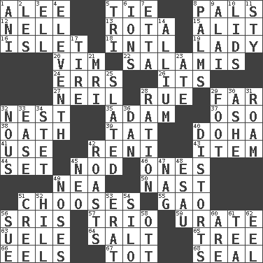 ACROSS 1. Toward shelter 5. Make a knot 8. Friends 12. 1994 drama film starring Jodie Foster 13. Round or rotation of duties 15. Set down 16. Small island 18. International (abbr.) 19. Kenny Rogers chart-topper in '80 20. Zeal 22. Deli grouping 24. Blunders 26. It is 27. Famous astronaut Armstrong 28. Regret 29. Distant 32. A home for chicks 35. First of billions? 37. Bear (Spanish) 38. Pledge 39. Make lace 40. Capital of the state of Qatar 41. Purpose 42. Painter Guido (1575-1642) 43. A distinct part 44. Arrange properly for use 45. Allow head to fall sleepily 46. Washington bills 49. Teachers' org. 50. Political cartoonist Thomas 51. Opts 55. E Mali city 56. Indian titles of respect 57. Musical group of three 59. A salt of uric acid 63. Ubangi River tributary 64. Table seasoning 65. Relationship diagram 66. Snakelike fish 67. Small child 68. Lick closed DOWN 1. Black tropical American cuckoo 2. French article 3. Pipe bend 4. Veterans Day date 5. Three (prefix) 6. Charged atoms 7. Singer James 8. Insides of hands 9. Jai _ 10. Hats (slang) 11. Filthy place 14. Plant genus of onion and garlic 17. Hoop that covers a wheel 21. Medical imaging device (abbr.) 23. Had dinner 25. Scheduled 28. Food allowance for one day 29. Pick up the tab 30. American tennis player Robert 31. Wander 32. Common sense 33. Comfort 34. Proofreading order 36. One of the 12 tribes of Israel 40. What propaganda does 42. Ridicules or criticizes harshly 45. Modern: prefix 47. Tired old horse 48. He sold his birthright 49. Olfactory organs 51. Algonquian 52. Land elevation 53. Part of Q.E.F. 54. Grain storage tower 56. Take to court 58. Baseball player Mel 60. "We ___ not amused" (Victoria) 61. Beverage made from leaves 62. Snakelike fish