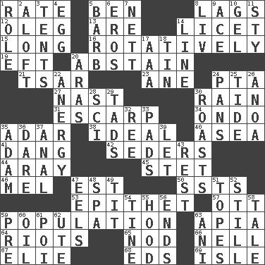 ACROSS 1. Assign a rank or rating to 5. Benjamin's nick name 8. Fails to keep up a pace 12. Cassini of fashion 13. "We ___ not amused" (Victoria) 14. It is permitted: Lat. 15. Protracted 16. Producing rotation 19. Newt 20. Choose not to consume 21. Russian ruler of old 23. A saturated hydrocarbon 24. Parent Teacher Association (abbr.) 27. Political cartoonist Thomas 30. Precipitation 31. Fortification 34. Southwest Nigerian state 35. The sixth month of the Jewish calendar 38. Standard of perfection 40. Toward the sea 41. Mild oath, euphamism for damn 42. Spring feasts 44. Like ___ of sunshine 45. Proofreading order 46. Cartoonist voice _ Blanc 47. Eastern Standard Time (abbr.) 50. Fast planes 53. Curse 57. Baseball player Mel 59. Census information 63. Capital of Western Samoa 64. Debaucheries 65. Dreamland 66. 1994 drama film starring Jodie Foster 67. Writer Wiesel 68. Begley and Asner 69. Small island DOWN 1. Hero or heavy, e.g. 2. Upward 3. Portable shelters 4. Ovum 5. Sharp remark 6. Greek god of love 7. Remaining after all deductions 8. 54 in ancient Rome 9. Adept person 10. Set 11. Filthy place 14. Actor's bit 17. Auto club (abbr.) 18. Metal container 20. Ancient river in northeast Turkey 22. Disorder of the immune system 24. Baking dishes 25. Periodic rise and fall of the sea level 26. Small Philippine buffalo 28. _-fi 29. Small boys 30. Ridicules or criticizes harshly 32. To separate or throw off 33. Writing tablets 35. First man 36. Have the gumption 37. Of or related to the anus 39. Allow 43. Respite 47. Snakelike fish 48. Health resort 49. Teat (slang) 51. Drinks excessively 52. Not moving 54. Prong on a fork 55. Parka part 56. Extremities 58. Story 59. Before (prefix) 60. Lubricate 61. Luau course 62. Shoshoni 63. Black tropical American cuckoo