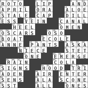 ACROSS 1. Printing process, for short 5. Mouth edge 8. Plus 11. Showery time 13. Mouth or opening 14. _ vera 15. Having lost freshness 16. Head covering 17. Deli pickle 18. Curvy letter 19. Distinctive style or manner 21. Lessep's creation 22. Person who is morally reprehensible 24. Sign of things to come 25. Motion picture awards 27. Bear (Spanish) 29. Water vessel 30. Learning spot: Fr. 32. Singer Murray 33. Leg coverings 35. "____ silly question..." 39. Sibling's daughter 41. Proofreading order 42. Single 43. Develop 45. Water falling in drops from the sky 48. Root beer relative 49. Attaches a signature 50. Parka part 52. Three (prefix) 55. Arabian gulf 56. Atmosphere 57. Keyboard key 59. Elected reps. 60. Wing 61. Biscuitlike quick bread 62. Fast jet (abbr.) 63. Everything 64. Singles DOWN 1. To erase 2. Elects 3. File 13 4. Petroleum 5. Event scenes 6. SW Asia republic 7. Infant food 8. Place in a line 9. Pitcher Ryan 10. Small valley 12. Prying instrument 14. First man 20. Raised railways 21. Calm and collected 23. Eroded 25. Chief or king in Benin or Nigeria 26. Boy, to dad 27. Sep. follower 28. Distress signal 30. Compass dir. 31. Artist's stand 33. Fenced enclosure 34. Adept person 36. Ski resort town in Vermont 37. Barrel 38. Had dinner 40. Charged atoms 43. Environmental prefix 44. Methods 45. Amusement-park features 46. Representative 47. Restaurants 49. Backtalk 50. Land elevation 51. Relating to the mouth 53. French philosopher Descartes 54. Angers 56. American Automobile Association (abbr.) 58. Non-commissioned officer (abbr.)