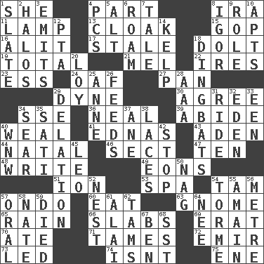 ACROSS 1. A female animal or person 4. Component 8. Retirement account (abbr.) 11. Desk light 13. Hide under a false appearance 15. Republican Party 16. Set down 17. Having lost freshness 18. Dunce 19. Add up to 21. Cartoonist voice _ Blanc 22. Angers 23. Double-curved letter 24. Clumsy lout 27. Baking dish 29. Unit of force 30. Match 34. Compass dir. 36. Actress Patricia 39. Stay 40. Welt 41. Ferber et al. 43. An important port of Yemen 44. Relating to or accompanying birth 46. Religious group 47. "___ Little Indians" 48. Compose 49. Immeasurably long periods of time 51. Electrically charged atom 53. Health resort 54. Scottish cap 57. Southwest Nigerian state 60. Consume 63. Dwarf 65. Precipitation 66. Broad, flat, thick pieces 69. Part of Q.E.F. 70. Had dinner 71. Domesticates 72. Independent ruler or chieftain 73. Directed 74. Is not 75. Compass dir. DOWN 1. Schedule 2. Saint headwear 3. Sends forth 4. Personal Computers (abbr.) 5. Keyboard modifier key 6. Wander 7. Falsehood 8. Russian composer Stravinsky 9. Hero or heavy, e.g. 10. Tenement units (abbr.) 12. Parent Teacher Assoc. 14. Seaweed 18. Empty-headed or silly people 20. Myrna of the movies 25. Queen of England 1702-14 26. Eats 28. Auto club (abbr.) 29. Accusation by an informer 31. Travel on or in a vehicle 32. Locale of original sin 33. Car or cant ending 34. Dry up 35. Suttee (variant) 37. A saturated hydrocarbon 38. Shoestrings 40. Compass dir. 42. Discontinue 45. Lion 50. Tired old horse 52. A home for chicks 54. Singer Mel 55. At full speed 56. Distance measurement (Brit.) 57. Of the mouth 58. Nathan's nickname 59. Passed on 61. Mountain range southwest of Kyrgyzstan 62. Scottish caps 64. Born 67. Benjamin's nick name 68. Fast jet (abbr.)