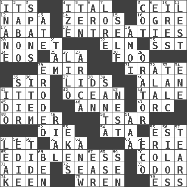 ACROSS 1. ___ a Wonderful Life 4. Slanted text style (abbr.) 8. To provide with a ceiling 12. California wine valley 14. Nothings 16. Legendary monster 17. Blind as ____ 18. Pleas 20. Music written for nine 22. Shade tree 23. Fast jet (abbr.) 24. Greek goddess of the dawn 25. Chicken ___ king 28. Egg _ yung 30. Arab leader 31. Feeling or showing extreme anger 35. Title for a knight 37. Hats (slang) 40. Actor Alda or Thicke 41. "Tell ____ the Marines!" 42. Sea 44. Lie 45. Passed on 46. Queen of England 1702-14 47. The grampus (Milton) 48. Abalone 50. Russian ruler of old 52. Pass on 54. "One Day ___ Time" 55. Eastern Standard Time (abbr.) 58. Allow 61. Alias (abbr.) 63. Nest on high 65. The property of being fit to eat 70. Root beer relative 71. Helper 72. Gospel singer Marvin 73. Aroma 74. Peachy ____! 75. Songbird 76. Curvy letter DOWN 1. Lacking in sense or substance 2. Off limits 3. Connects, as a bridge 4. Ending with capital 5. Nine, plus one 6. Nonscientific branch of learning 7. Old wives' tales, e.g. 8. Small bed 9. Armor plate that protects the chest 10. Angers 11. For fear that 13. Had dinner 15. Automatically 19. Mine, in Marseilles 21. Scottish cap 26. _ and Stitch 27. N. Chile seaport 29. Speaker 30. Worn away 32. Having or resembling wings 33. Baby powder 34. Compass dir. 35. Agitate 36. Detail 38. Lair 39. Before Barbara or Clara 41. Wedding promise 43. Egg locale 49. Monetary unit of Yemen 51. Auto club (abbr.) 53. Makes supply last 55. Wear away 56. Grain storage towers 57. Pulls into pieces 58. Path through which fluid escapes 59. Singer Brickell 60. Periodic rise and fall of the sea level 62. Afresh 64. Environmental prefix 66. Benjamin's nick name 67. Ewer handle 68. Compass dir. 69. Elected rep.