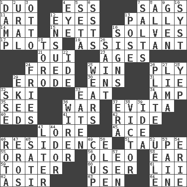 ACROSS 1. Superhero pair 4. Double-curved letter 7. Settles 11. Nonscientific branch of learning 12. Sight organs 13. Chummy 14. Floor protector 15. Remaining after all deductions 16. Finds the solution 17. Ground plans 19. Aide 21. Fr. "Yes" 23. Grows older 24. Flintstone 25. Acquire through effort 26. Strand of rope, yarn or thread 29. Eat (away) 30. Followers of ems 31. Untruth 32. What Jean-Claude Killy likes to do 33. Ingest 34. Electrical Unit 35. Perceive with the eye 36. Armed conflict 37. Webber/Rice musical 40. Begley and Asner 41. It is 42. Travel on an animal 43. Old wives' tales, e.g. 45. Adept person 46. Dwelling 51. Grayish beige 55. Speaker 56. Margarine 58. Ewer handle 59. Carrier 60. One who uses or employs something 61. Cards in a Roman deck? 62. SW Saudi Arabia district 63. Fenced enclosure 64. Compass dir. DOWN 1. Moist 2. Mountain range 3. Von Bismarck 4. Sight organ 5. Stalk of a moss capsule 6. Fast planes 7. Table seasonings 8. Inventor's middle name 9. Small, secluded valley 10. System (abbr.) 12. Took place subsequently 13. Introduce or present, as a question 16. Public displays of written messages 18. "Corrida" creature 20. Inhabitant of Heaven 22. Binary compound 24. Strips of potato fried in deep fat 25. Puts on (as clothing) 26. Food holder 27. Pale green bean 28. Slangy assent 29. Supplemented with great effort 32. Compass dir. 33. Eroded 36. One who wires 37. Epoch 38. Winning man's name 39. The main thing one is thinking about 43. 61 cubic inches 44. Scent 46. Round or rotation of duties 47. Greek god of love 48. Suttee (variant) 49. Overturn; upset 50. Otherwise 52. Ubangi River tributary 53. Ache 54. One of the Great Lakes 57. Car or cant ending