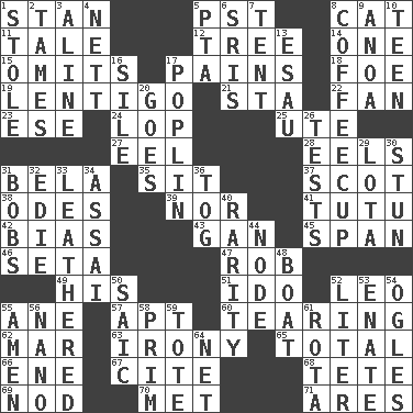 ACROSS 1. Comedian Laurel of Laurel & Hardy 5. Pacific Standard Time (abbr.) 8. Feline 11. Falsehood 12. Family _ (genealogy) 14. Single 15. Leaves out 17. Aches 18. Enemy 19. Small, flat, pigmented spot on the skin 21. R.R. building 22. Air blower 23. Compass dir. 24. Chop off 25. Shoshoni 27. Snakelike fish 28. Snakelike fish 31. Actor Lugosi 35. Be seated 37. Native of Scotland 38. Lyric poems 39. Not either 41. Ballerina skirt 42. Prejudice 43. Separate the seeds from cotton 45. Connect, as a bridge 46. Bristle 47. Director Reiner 49. Part of HMS, perhaps 51. Wedding promise 52. Lion 55. A saturated hydrocarbon 57. Fitting 60. Rending 62. Spoil 63. Literary sarcasm 65. Add up to 66. Compass dir. 67. Quote 68. False hair 69. Lower and raise head in agreement 70. Was introduced to 71. Ancient Greek god of war DOWN 1. Took without asking 2. Domesticates 3. Place in a line 4. Remaining after all deductions 5. Parent Teacher Association (abbr.) 6. Indian titles of respect 7. Portable shelter 8. Java holder (2 wds.) 9. Small Philippine buffalo 10. Adolescent 13. He sold his birthright 16. Drop; flow; fall 17. Cotton for raincoats, e.g. 20. Leaves 26. Trials 29. Globular water bottle used in Asia 30. Astound 31. Moves up and down 32. Singer Brickell 33. Resembling or made to resemble leather 34. Slender Brazilian palm 36. Coat; cloak 40. Noteworthy scarcity 44. Connecting point 48. Water vessel 50. Ketch in the Levant 52. 61 cubic inches 53. Maternal 54. Stares at amorously 55. So be it 56. Billionth: prefix 58. Demure 59. Carry 61. Round or rotation of duties 64. Fish or hair follower