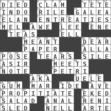 ACROSS 1. Passed on 5. Dollar (slang) 9. False hair 13. Southeast Asian peninsula 14. Cause heat under the collar 15. An organ shaped like a helmet 16. Enthusiasm 17. Pleas 19. Cartoonist voice _ Blanc 20. Deep reverence 21. Area sheltered from the wind 22. Compass dir. 23. Afternoon social gatherings 25. Pipe bend 26. Intended 30. Letter starter 34. Some stationery 35. Silent film actress Nazimova 36. Airs 39. Pulls into pieces 42. Drop; flow; fall 43. SW Saudi Arabia district 44. Confronts 46. Brief written record 47. _ dish (used to culture cells) 48. Alias (abbr.) 51. Ubangi River tributary 54. Chewing product 57. Third mo. 58. Binary compound 60. "___ Maria" 62. Conciliate 65. Supplemented with great effort 66. Vegetable dish 67. Of or related to the anus 68. Painter Guido (1575-1642) 69. Downhill vehicle 70. 1994 drama film starring Jodie Foster 71. Johnson of "Laugh-In" DOWN 1. South Vietnam president (1954) 2. An arm off of a larger body of water 3. Peak District village in England 4. Spanish title 5. Ship's personnel 6. Actor's bit 7. The first octave above the treble staff 8. Haggard of country music 9. Make lace 10. Writer Wiesel 11. Adolescent 12. Comfort 15. Highlander 18. Snakelike fish 20. Toward the sea 24. Electrical Unit 27. Fitting 28. Born 29. _____ steamer (cargo ship) 30. Hyrax 31. Connecticut Ivy Leaguer 32. Everything 33. Actress Charlotte 36. Baking dish 37. Bear (Spanish) 38. Be seated 40. To riddle 41. Arrange properly for use 45. Loyal 48. Among 49. Krazy ___ of comics 50. Believer in; advocate of (suffix) 52. Member of a famous L.A. basketball team 53. Incident 54. Global Positioning Systems (abbr.) 55. Mountain range 56. Undercover agent 58. Slanted text style (abbr.) 59. Small valley 61. Singer Brickell 63. Groovy apt. 64. A saturated hydrocarbon 65. Period