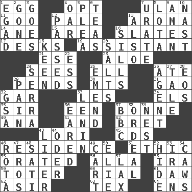 ACROSS 1. Ovum 4. Elect 7. Uhlan (variant) 11. Thick or sticky substance 12. Light colored 13. Odor 14. A saturated hydrocarbon 15. Type of rug 16. Chalkboards 17. Writing tables 19. Aide 21. Compass dir. 23. Medicinal plant 24. Observes 25. Pipe bend 26. Had dinner 29. Depends 30. Mountains (abbr.) 31. E Mali city 32. Slender fish 33. French article 34. Raised railways 35. Title for a knight 36. Car or cant ending 37. Maid-servant 40. Santa ___, CA 41. Plus 42. Cy Young winner Saberhagen 43. Australian parrot (variant) 45. Music discs 46. Dwelling 51. Moral principle 55. Declaimed 56. Silent film actress Nazimova 58. Retirement account (abbr.) 59. Carrier 60. Monetary unit of Yemen 61. Obsolete 62. SW Saudi Arabia district 63. John Ritter's dad 64. Followers of ems DOWN 1. Mild oath 2. Went 3. Moves 4. Boat paddle 5. Entreaty 6. Beverages made from leaves 7. A salt of uric acid 8. Globular water bottle used in Asia 9. So be it 10. Political cartoonist Thomas 12. Went by 13. In addition 16. Beverly of Met fame 18. Peachy ____! 20. Table seasonings 22. Double-curved letter 24. Father Junipero _ 25. Make improvements or corrections to 26. Rep 27. Story 28. Greek goddess of the dawn 29. Ache 32. Girls' org. (abbr.) 33. Soviet premier 1918-24 36. Having ears or earlike features 37. English channel? 38. Severe or trying experience 39. Egg locale 43. 61 cubic inches 44. Baltic tributary 46. Round or rotation of duties 47. Greek god of love 48. Suttee (variant) 49. Haul 50. Writer Wiesel 52. Flintstone garb 53. SW Asia republic 54. Crow sounds 57. Not strict