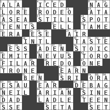 ACROSS 1. According to 4. On the rocks 8. Tired old horse 11. Old wives' tales, e.g. 13. Cowboy competition 15. "One Day ___ Time" 16. Toward the sea 17. Free of sound 18. Blemish 19. Portable shelters 21. Pipe bend 22. Not wild 23. Period 24. Compass dir. 27. Atmosphere 29. International (abbr.) 30. Clothes sense 34. Double-curved letter 36. An important port of Yemen 39. Unemotional 40. Give off 41. Mole, birthmark 43. "Corrida" creature 44. Having threads 46. Make new 47. Single 48. Heavy duty weighing machine 49. Merit 51. Benjamin's nick name 53. Indian title of respect (Mr.) 54. Mouth or opening 57. Son of Isaac 60. Ewer handle 63. Debunk (Brit. slang) 65. Famous astronaut Armstrong 66. Believer in; advocate of (suffix) 69. Trig term 70. Male parent 71. Dipping utensil 72. Adolescent 73. Compass dir. 74. Stalk of a moss capsule 75. Arrange properly for use DOWN 1. Having winglike extensions 2. Failure 3. Sports stadium 4. Big collection agency 5. Small bed 6. Singer Brickell 7. Small valley 8. California wine valley 9. Smallest unit of an element 10. Yard entry 12. Consume 14. Spanish pot 18. Ski resort town in Vermont 20. Elected rep. 25. Comedian Laurel of Laurel & Hardy 26. A person who is older than you are 28. It is 29. Byzantium, centuries later 31. Within a short period 32. Become fatigued 33. Environmental prefix 34. Arab leader 35. Grain storage tower 37. Night before a holiday 38. Unclothed pictures 40. Lizard (obsolete) 42. Fly high 45. To riddle 50. To free from 52. Anneal 54. Off-Broadway awards 55. Indian princess (variant) 56. Representative 57. Conclusions 58. Oceans 59. Assistant 61. Ancient river in northeast Turkey 62. Travel on or in a vehicle 64. Eastern Standard Time (abbr.) 67. The first octave above the treble staff 68. Teachers' org.
