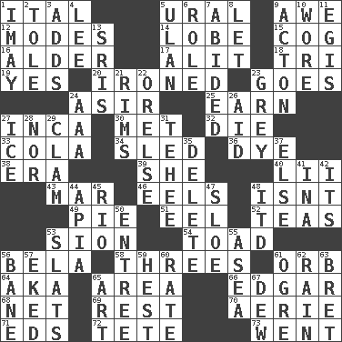 ACROSS 1. Slanted text style (abbr.) 5. Mountain range 9. Deep reverence 12. Methods 14. Ear part 15. Gear tooth 16. Tree or shrub in the Birch family 17. Came down and settled, as after flight 18. Three (prefix) 19. Affirmative reply 20. Pressed 23. Leaves 24. SW Saudi Arabia district 25. Merit 27. South American Indian 30. Was introduced to 32. Expire 33. Root beer relative 34. Downhill vehicle 36. Color 38. Epoch 39. A female animal or person 40. Cards in a Roman deck? 43. Impair 46. Snakelike fish 48. Is not 49. Sliced dessert 51. Snakelike fish 52. Afternoon social gatherings 53. The Jewish people; Israel 54. Frog relative 56. Actor Lugosi 58. Threesomes 61. Globe 64. Alias (abbr.) 65. Length times width 66. _ Allan Poe 68. Fish or hair follower 69. Remainder 70. Nest on high 71. Begley and Asner 72. Wig 73. Left DOWN 1. "If ____ say so..." 2. Lacquered or enameled metalware 3. Sums up 4. Area sheltered from the wind 5. ____ Bator 6. Hero or heavy, e.g. 7. Tolerated 8. Allow 9. 13-14th century defensive garment 10. Had on 11. Armor plate that protects the chest 13. Indian titles of respect 21. Basketball hoops 22. Threatening words 23. Jennifer or Joel 24. American Automobile Association (abbr.) 26. Assist 27. Frozen water 28. Not either 29. Burrowing marine mollusk 31. Giggle 35. Erase 37. Otherwise 41. _ tizzy (2 wds.) 42. It is 44. Capital of Western Samoa 45. River (Sp.) 47. _ gin 48. It would 50. Main course 53. Narrow boards 55. Toward the sea 56. Object of repulsion 57. Supplemented with great effort 59. Behest 60. Pace 61. Legendary monster 62. Water falling in drops from the sky 63. Cy Young winner Saberhagen 65. Tate display 67. Morning condensation