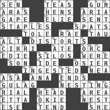 ACROSS 1. Elected rep. 4. Beverages made from leaves 8. Chewing product 11. Ancient river in northeast Turkey 13. Coop moms 14. Operatic vocal solo 15. Stare wonderingly 16. Writer Wiesel 17. Transmitted 18. Paper fasteners 21. Arguments over trivial matters 22. Lacquered or enameled metalware 23. Actress Charlotte 25. The 19th letter of the Greek alphabet 26. Keyboard modifier key 29. What propaganda does 32. High-altitude cloud 34. Had dinner 35. The grampus (Milton) 38. Singer Brickell 39. Grain storage towers 41. Past tense of be (plural) 43. Manchild 44. Binary compound 45. Flexible twig of a willow tree 46. Eaten 50. Teachers' org. 51. White ___ sheet 54. Santa ___, CA 55. Conclusions 57. Russian prison camp 59. Nestling 63. Monetary unit of Yemen 64. Froth on beer 67. Length times width 68. Singer James 69. Migrant worker of the '30s 70. Egg locale 71. Compass dir. 72. Be inclined (to) 73. A female animal or person DOWN 1. Droops 2. Part of Q.E.F. 3. California wine valley 4. College papers 5. Snakelike fish 6. Black tropical American cuckoo 7. Compass dir. 8. Relatively large 9. National forest in Provo, Utah 10. Taiwanese island in East China Sea 12. Back-to-school mo. 14. Viper 19. Farming town in central California 20. Connecticut Ivy Leaguer 21. Arrange properly for use 23. Printing process, for short 24. Ancient Greek god of war 26. Adept person 27. Flaplike coverings 28. Musical group of three 30. Falsehoods 31. Sty mamas 33. Painter Guido (1575-1642) 36. It's straight from the horse's mouth 37. Algonquian 39. Omen 40. It may be bright or harebrained 42. Period 45. Probability 47. Tired old horse 48. Watched over 49. Compass dir. 51. Match 52. Sets or collections 53. Having winglike extensions 56. Comedian Laurel of Laurel & Hardy 58. Chicken ___ king 60. Angers 61. Soft 62. Yard entry 64. Being at a high temperature 65. Make supply last 66. The 18th letter of the Arabic alphabet