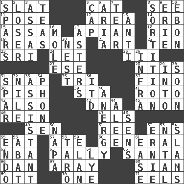 ACROSS 1. Narrow board 5. Feline 8. Perceive with the eye 11. Airs 12. Type of rug 14. Globe 15. Indian state 17. Bee-related 18. _ de Janeiro 19. Thinks logically 21. Nonscientific branch of learning 22. "___ Little Indians" 23. Indian title of respect (Mr.) 24. Allow 25. One more than two 27. Compass dir. 28. Nuclear Threat Initiatives 31. Fastener 35. Three (prefix) 37. Fine (Spanish) 38. Expression of disdain 39. R.R. building 41. Printing process, for short 42. In addition 43. Heredity factor (abbr.) 45. At once, immediately (arch.) 46. It's straight from the horse's mouth 47. Raised railways 49. Elected rep. 51. Portuguese money of account (variant) 52. Followers of ems 55. Consume 57. Had dinner 60. Commissioned military rank 62. Basketball assoc. 63. Friendly 65. Before Barbara or Clara 66. One of the 12 tribes of Israel 67. Like ___ of sunshine 68. Thailand, formerly 69. Baseball player Mel 70. Single 71. Snakelike fish DOWN 1. Practice fights 2. Failure 3. Slender Brazilian palm 4. Beverages made from leaves 5. Head covering 6. Operatic vocal solo 7. Rend 8. Making a chance decision by using lots 9. One of the Great Lakes 10. Inky black, to poets 13. Against 16. Undercover agent 17. Michaelmas daisies 20. A home for chicks 26. Kind of red light 29. To the inside or interior of 30. Within a short period 31. Practice fight 32. The longest river in the world 33. Aide 34. Give a jingle 36. It would 40. Disorder of the immune system 44. Toward shelter 48. Elected reps. 50. California wine valley 52. Bert's buddy 53. Brizilian seaport 54. Shuts with force 55. Inside; within (prefix) 56. Blind as ____ 58. Edible starchy tuberous root 59. Liveliness 61. Relaxation 64. Sodium hydroxide