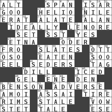 ACROSS 1. Keyboard modifier key 4. Connect, as a bridge 8. Austrian river, tributary to the Danube 12. Thick or sticky substance 13. Sun: prefix 14. The longest river in the world 15. Part of Q.E.F. 17. Having winglike extensions 18. Actor Alda or Thicke 19. Under perfect conditions 21. Poe poem 23. Arrange properly for use 24. Fast jet (abbr.) 26. It is so 27. Inactive volcano in Sicily 28. River in Europe 30. From 31. Chalkboards 34. Baseball player Mel 37. Bear (Spanish) 38. Consumed 39. "Barney Miller" actor Jack 40. Snakelike fish 41. Spring feasts 42. Label 43. Deli pickle 44. On the rocks 46. Set 47. Compass dir. 50. Lair 51. Gillaume's butler role 54. Contrary to your interests or welfare 57. Mine, in Marseilles 58. Slender Brazilian palm 60. Hoop that covers a wheel 62. Basketball hoops 63. Lacking originality or spontaneity 64. Solemn pledge 65. Proofreading order 66. Lie 67. Compass dir. DOWN 1. Grow older 2. Australian parrot (variant) 3. Inedible or poisonous agaric 4. Makes a sale 5. Live dramatic performances 6. Small island 7. Christmas carol 8. More lacking in sense or substance 9. Grain storage towers 10. Having or resembling wings 11. French philosopher Descartes 13. Actor Linden 16. Adolescent 20. _ moment's notice (2 wds.) 22. Snake ____ (dice throw) 25. Carrier 27. Celtic language 29. Habitations of wild animals 30. Enemy 31. Stitch closed the eyes of (a falcon) 32. Dipping utensil 33. Had dinner 34. Clearly or manifestly demonstrative 35. Frog relative 36. Coat; cloak 41. Grain storage tower 43. Stop 44. Binary compound 45. Foregone conclusion 46. Dwarf 48. Relating to the nose 49. Peak District village in England 51. Soap units 52. Give off 53. Political cartoonist Thomas 55. Compete 56. Greek god of love 59. R.R. building 61. She-sheep