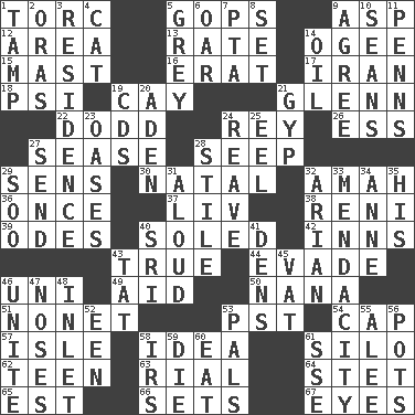 ACROSS 1. Torque (variant) 5. Republicans 9. Viper 12. Type of rug 13. Assign a rank or rating to 14. Double curve, resembling the letter S 15. Vertical spar for supporting sails 16. Part of Q.E.F. 17. SW Asia republic 18. 23rd letter of the Greek alphabet 19. Island 21. American astronaut and politician John 22. Texas town _ City 24. Marina Del _, California 26. Double-curved letter 27. Gospel singer Marvin 28. Ooze 29. Elected reps. 30. Brizilian seaport 32. Housemaid 36. Single time 37. 54 in ancient Rome 38. Painter Guido (1575-1642) 39. Lyric poems 40. Having a sole or soles 42. Restaurants 43. Loyal 44. Elude 46. Single; one (prefix) 49. Help 50. Nanny 51. Music written for nine 53. Pacific Standard Time (abbr.) 54. Head covering 57. Capri or Wright 58. The content of cognition 61. Grain storage tower 62. Adolescent 63. Monetary unit of Yemen 64. Proofreading order 65. Eastern Standard Time (abbr.) 66. Arranges properly for use 67. Snake ____ (dice throw) DOWN 1. Pack (down) 2. Mouths or openings 3. Dwelling 4. Feline 5. Jennifer or Joel 6. Boat paddle 7. Parent Teacher Association (abbr.) 8. Arrange properly for use 9. Match 10. Seines 11. Actor Sean's family 14. Petroleum 19. Music discs 20. An important port of Yemen 21. Swindle 23. Fertile tracts in a desert 24. Break or tear apart 25. Snakelike fish 27. Post 28. Vertical member of a panel or frame 29. "Barney Miller" actor Jack 31. Verbally 32. Believer in; advocate of (suffix) 33. Ananias' fault 34. Queen of England 1702-14 35. Part of HMS, perhaps 40. _ Lanka 41. Habitations of wild animals 43. Make lace 45. Large container 46. Join together 47. Olfactory organs 48. An arm off of a larger body of water 52. Car or cant ending 53. Friends 55. Toward shelter 56. Cooking vessels 58. Big collection agency 59. Pass on 60. Ingest 61. Compass dir.