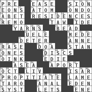 ACROSS 1. Before (prefix) 4. Comfort 8. The Jewish people; Israel 12. Immeasurably long periods of time 14. Smallest unit of an element 15. Southwest Nigerian state 16. Collude with 17. Homes 20. San ____ (Riviera town) 21. The 23rd letter of the Hebrew alphabet 22. Binary compound 23. Entertaining tales 27. Necklace unit 29. Ubangi River tributary 31. Ancient Persian 34. Prevent from occurring 35. Singer Murray 36. To erase 39. ___ good deed 41. Comedian Laurel of Laurel & Hardy 42. Washington bills 43. Flat circles 46. Pig sound 47. Singer Brickell 48. At sea 51. To the left, to Queeg 54. Sep. follower 56. 54 in ancient Rome 58. Austrian river, tributary to the Danube 61. Conciliate 66. Unable to walk 67. Edible starchy tuberous root 68. Of or related to the anus 69. Paradise 70. System (abbr.) 71. Allows 72. Compass dir. DOWN 1. Lightbulb-shaped fruit 2. Loose flowing garment 3. Foe 4. Ewer handle 5. Had dinner 6. Distress signal 7. Send forth 8. Male child 9. Event 10. Wrote a lyric poem 11. Sense of smell 13. Portico 18. Small moist lump or mass 19. She-sheep 24. Sorrow 25. Fish or hair follower 26. Downhill vehicle 28. Collect or gather 30. Wear away 32. Heredity factor (abbr.) 33. Car or cant ending 34. Writing tables 36. Friend of Pooh 37. Cuckoo 38. Elected representatives 40. Opera by Verdi 44. Small drink 45. Corporate head (abbr.) 49. Connecticut Ivy Leaguer 50. Small island 52. Cause heat under the collar 53. Sadhe (variant) 54. Chooses 55. Supercomputer manufacturer 57. Small bottle 59. So be it 60. French philosopher Descartes 62. Plant holder 63. A saturated hydrocarbon 64. Make lace 65. Raised railways
