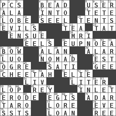 ACROSS 1. Personal Computers (abbr.) 4. Necklace unit 8. One who uses or employs something 12. In the manner of 13. To the inside or interior of 14. False hair 15. Ear part 17. Sew up the eyelids of hawks and falcons 18. Portable shelters 19. Vices 21. Afternoon social gathering 23. Make lace 24. Take place subsequently 26. Medical imaging device (abbr.) 28. Snakelike fish 30. Normal relaxed breathing 34. Ribbon knot 37. ____ Jay Lerner 39. Having or resembling wings 40. Nilotic language 41. Wanderer 43. Eastern Standard Time (abbr.) 44. Legendary monster 46. Suttee (variant) 47. Turn to the right 48. Leopard's kin 51. Writer Wiesel 54. 54 in ancient Rome 55. 61 cubic inches 58. Trim (branches) 61. Marina Del _, California 63. An arm off of a larger body of water 65. Wear away 67. Armor plate that protects the chest 71. The sixth month of the Jewish calendar 72. Edible starchy tuberous root 73. Old wives' tales, e.g. 74. First lady 75. Fast planes 76. Grant temporary use of 77. Portuguese money of account (variant) DOWN 1. Diluted with white 2. Garlic unit 3. Unit of acoustic absorption 4. Altar cloth linen 5. Compass dir. 6. Had dinner 7. Stupid person 8. Shoshoni 9. Emitted 10. Singer James 11. Repose 16. Otherwise 18. Canvas cover 20. Take to court 22. Australian flightless bird 25. Liveliness 27. _ tizzy (2 wds.) 29. Agitate, as a liquid 30. Maternal 31. Cassini of fashion 32. Relaxation 33. Johnson of "Laugh-In" 34. Alliance 35. Ending for "Through" and "Enough" 36. Had on 38. Wet nurse (var.) 42. Deli pickle 45. Snakelike fish 49. Hoop that covers a wheel 50. "___ Maria" 52. One more than two 53. Inactive volcano in Sicily 56. A person who is older than you are 57. Rob, plunder, or pillage 58. Allows 59. Mouths or openings 60. Sweet dark-red dessert wine 62. Shout 64. Family _ (genealogy) 66. Two (Sp.) 68. Thick or sticky substance 69. Lyricist Gershwin 70. Elected rep.
