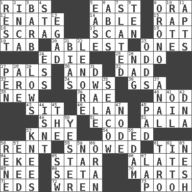 ACROSS 1. Chest bones 5. Compass direction 9. Mouth or opening 12. Related on the mother's side 14. Competent 15. Hit sharply and swiftly 16. Strangle with an iron collar 17. Skim 18. Baseball player Mel 19. Keyboard key 20. Most capable 23. Washington bills 24. Singer Brickell 25. Inside; within (prefix) 27. Friends 30. Added to 32. Male parent 33. Greek god of love 34. Sty mamas 36. Girls' org. (abbr.) 38. ___ Haven, CT 39. Actress Charlotte 40. Dreamland 43. Be seated 46. Style 48. Ache 49. Like a shrinking violet 51. Environmental prefix 52. Silent film actress Nazimova 53. Leg joint 54. Wrote a lyric poem 56. Monthly bill 58. Frozen precipiation fell 61. Metal container 64. Supplement with great effort 65. Play the lead 66. Having winglike extensions 68. Born 69. Stalk of a moss capsule 70. Shops 71. Begley and Asner 72. Songbird 73. "Silly old bear" DOWN 1. Take ten 2. South American Indian 3. Sharp remark 4. R.R. building 5. Comfort 6. Lettered men learn these first 7. Scheduled 8. "___ Little Indians" 9. U. of Maine site 10. Pace 11. Tenement units (abbr.) 13. Mild oath 21. Prejudice 22. Poe poem 23. Probability 24. Double-curved letter 26. Tired old horse 27. Writing instrument 28. "We ___ not amused" (Victoria) 29. Coldest temperatures 31. A sleeping potion; an opiate (poet.) 35. Manatee 37. Of or related to the anus 41. Lubricate 42. Heredity factor (abbr.) 44. Is not 45. Definite Article 47. Thickened enlargement 48. Writing tablet 50. Last 53. Leg joints 55. Dutch treat 56. French philosopher Descartes 57. Supplemented with great effort 59. Nathan's nickname 60. Northwest Algerian city 61. Edible starchy tuberous root 62. "Tell ____ the Marines!" 63. Delicate 65. Compass dir. 67. Pet locale