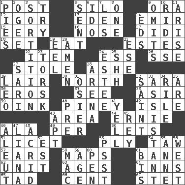 ACROSS 1. Mail 5. Grain storage tower 9. Mouth or opening 12. Russian composer Stravinsky 13. Locale of original sin 14. Arab leader 15. Suggestive of the supernatural 16. Olfactory organ 17. "You Light Up My Life" star Conn 18. Arrange properly for use 19. Consume 21. _____ Park, CO 22. A whole individual unit 24. Curvy letter 26. Compass dir. 27. Took without asking 28. American tennis player Robert 29. Den 30. 0 degrees 32. "Two Mules for Sister ____" 36. Greek god of love 37. Observe 38. SW Saudi Arabia district 39. Pig sound 40. Abounding in pines 42. Capri or Wright 43. Type of rug 44. Bert's buddy 46. According to 49. For each 50. Allows 51. It is permitted: Lat. 53. Apply oneself diligently 54. The 23rd letter of the Hebrew alphabet 57. Hearing organs 58. Atlas contents 61. Object of repulsion 62. A single undivided whole 63. Ripens 64. Restaurants 65. Small amount or degree 66. Penny 67. Proofreading order DOWN 1. Sliced desserts 2. Double curve, resembling the letter S 3. Determination 4. Attempt 5. Posted 6. Wedding promise 7. French article 8. Single 9. Leaves out 10. Amusement-park features 11. Get up 14. Begley and Asner 19. Snakelike fish 20. So be it 21. Compass dir. 23. Cod relative 24. First name in cosmetics 25. Quiet! 27. Indian skirt 28. Sports stadium 29. Lion 31. Flexible twig of a willow tree 32. Virtuous person 33. Helper 34. Cause heat under the collar 35. "We ___ not amused" (Victoria) 40. Before (prefix) 41. Shout 43. Fitting 45. Marina Del _, California 46. Eskimo relative 47. Climbing, woody, usually tropical vines 48. Bitter 52. Eastern Standard Time (abbr.) 53. Inconspicuous attention getter 55. Queen of England 1702-14 56. Compass direction 58. Big _ 59. Personal question 60. Fenced enclosure 61. Again