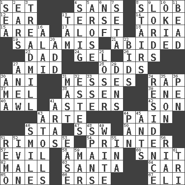 ACROSS 1. Arrange properly for use 4. Without 8. Messy guy 12. Ewer handle 13. Laconic 14. Casino tip 15. Length times width 17. At or to great height 18. Roberta Peters solo 19. Deli grouping 21. Stayed 23. Male parent 24. Set 26. Big collection agency 27. Among 28. Likelihood 30. Cuckoo 31. Makes clutter 34. Reproach for some lapse or misdeed 37. Cartoonist voice _ Blanc 38. NE Netherlands city 39. Compass dir. 40. Leather borer 41. Michaelmas daisies 42. Boy, to dad 43. Johnson of "Laugh-In" 44. Ache 46. R.R. building 47. Compass dir. 50. Plus 51. Full of chinks, cracks, or crevices 54. Hard copy producer 57. Morally bad or wrong 58. With great haste 60. In a ____ (agitated or irritated) 62. Promenade 63. Before Barbara or Clara 64. Auto 65. Singles 66. Celtic language 67. Connecticut Ivy Leaguer DOWN 1. Ocean 2. Hearing organs 3. Excercise machine 4. Major League Baseball Commissioner Bud 5. Came up 6. Overdraft (abbr.) 7. Stalk of a moss capsule 8. Flight of steps 9. Nobles 10. Migrant worker of the '30s 11. Necklace unit 13. Scottish cap 16. Jai ____ 20. Increase 22. Auction offers 25. Failure 27. Afresh 29. Habitations of wild animals 30. Nanny (var.) 31. Vertical spar for supporting sails 32. _____ Park, CO 33. Compass dir. 34. Home 35. Soon (poet.) 36. Fenced enclosure 41. Caspian sea tributary 43. Ringlike coral islands and reefs 44. Baking dish 45. Pismires 46. Grin 48. Connects, as a bridge 49. Compose 51. San ____ (Riviera town) 52. "Terrible" tsar 53. Relaxation 55. _ tizzy (2 wds.) 56. Monetary unit of Yemen 59. Third mo. 61. Three (prefix)