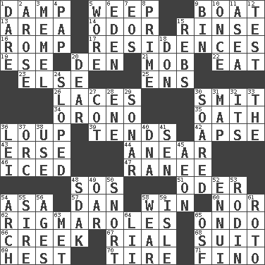 ACROSS 1. Moist 5. Shed a tear 9. Water vessel 13. Type of rug 14. Aroma 15. Remove soap 16. Play 17. Dwellings 19. Compass dir. 20. Lair 21. Crowd into 22. Erode 23. Otherwise 25. Followers of ems 26. Shoestrings 30. Stricken, poetically 34. U. of Maine site 35. Pledge 36. Central Nebraska county 39. Looks after 42. Domed church section 43. Celtic language 44. Approach 46. On the rocks 47. The wife of a rajah (variant) 48. Distress signal 51. River in Europe 54. White ___ sheet 57. One of the 12 tribes of Israel 58. Victory 60. Or not 62. Complicated, petty procedures 65. Southwest Nigerian state 66. Small stream 67. Monetary unit of Yemen 68. Set or collection 69. Command 70. Become fatigued 71. A pale, very dry sherry DOWN 1. Have the gumption 2. Came up 3. Klaipeda city 4. Infant food 5. Had on 6. Paradise 7. Greek goddess of the dawn 8. First class 9. Storage container 10. At one time in the past 11. Toward the sea 12. Trial 15. Confederate soldiers (slang) 18. Spanish title 20. Letter starter 24. Inclined 27. Small bed 28. Compass dir. 29. Underwater navigation system 30. Flew 31. Atlas unit 32. It is 33. Definite Article 36. Luau accessory 37. The grampus (Milton) 38. Purpose 40. Heredity factor (abbr.) 41. Elected rep. 45. A really long time 48. Neighbor of Neb. 49. Boat paddle 50. Derisive sound 52. World-weariness 53. "The Thinker" sculptor 54. Bowlike part 55. Father 56. Eons 58. Put on (as clothing) 59. Small island 61. Printing process, for short 63. Was introduced to 64. Cards in a Roman deck? 65. Order of Saint Francis (abbr.)