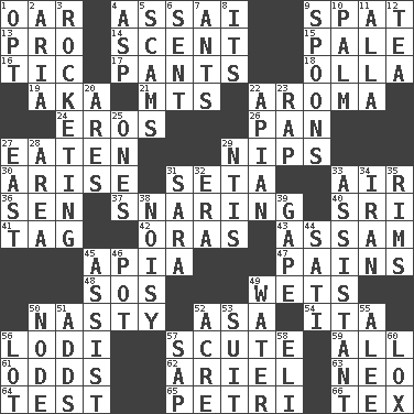 ACROSS 1. Boat paddle 4. Slender Brazilian palm 9. Petty quarrel 13. Adept person 14. Odor 15. Diluted with white 16. Nervous spasm 17. Leg coverings 18. Water jar 19. Alias (abbr.) 21. Mountains (abbr.) 22. Scent 24. Greek god of love 26. Baking dish 27. Consumed 29. Cuts off 30. Get up 31. Bristle 33. Atmosphere 36. Elected rep. 37. Catching in a trap 40. _ Lanka 41. Label 42. Mouths or openings 43. Indian state 45. Capital of Western Samoa 47. Aches 48. Distress signal 49. Soaks 50. Characterized by obscenity 52. White ___ sheet 54. Call ___ day 56. Farming town in central California 57. Scutum 59. 100% 61. Likelihood 62. Satellite of Uranus 63. Modern: prefix 64. Trial 65. _ dish (used to culture cells) 66. John Ritter's dad DOWN 1. Elect 2. Roberta Peters solo 3. Shooting up abruptly 4. Viper 5. Fraudulent business schemes 6. Emitted 7. Pismires 8. ___ a Wonderful Life 9. Soup utensils 10. Inside of hand 11. Silent film actress Nazimova 12. Beverage made from leaves 20. Ancient Greek god of war 22. Bee-related 23. Strike 25. Washington bills 27. 90 degrees 28. Length times width 29. Nuclear Threat Initiatives 31. "Two Mules for Sister ____" 32. Period 33. Helper 34. SW Asia republic 35. Basketball hoops 38. Annoyingly loud 39. Open wide 44. Suttee (variant) 45. Help 46. Cooking vessel 49. Wetness 50. Connecting point 51. Sums up 52. 1/640 square mile 53. Set of matching outer garments 55. Toward shelter 56. Car dealer's back yard 57. Plant excrement 58. Connecticut Ivy Leaguer 60. Brine-cured salmon
