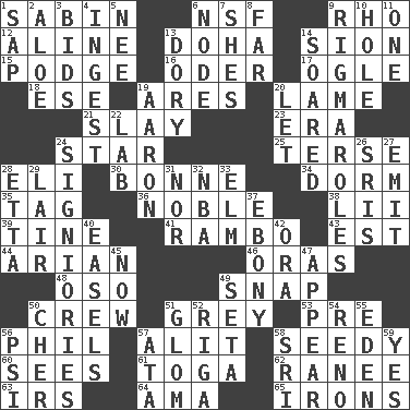 ACROSS 1. Unit of acoustic absorption 6. Overdraft (abbr.) 9. 17th letter of the Greek alphabet 12. Place in a line 13. Capital of the state of Qatar 14. The Jewish people; Israel 15. Puddle 16. Baltic tributary 17. Stare 18. Compass dir. 19. Ancient Greek god of war 20. Unable to walk 21. Kill 23. Epoch 24. Play the lead 25. Laconic 28. Connecticut Ivy Leaguer 30. Maid-servant 34. Dormintory (informal) 35. Label 36. Having high moral qualities 38. Cards in a Roman deck? 39. Prong on a fork 41. Role for Stallone 43. Eastern Standard Time (abbr.) 44. Believer in; advocate of (suffix) 46. Mouths or openings 48. Bear (Spanish) 49. Fastener 50. Ship's personnel 51. Jennifer or Joel 53. Before (prefix) 56. Silvers or Donahue 57. Set down 58. Full of seeds 60. Perceives with the eye 61. Ancient Roman robe 62. The wife of a rajah (variant) 63. Big collection agency 64. Nursemaid (var.) 65. Metal shackles DOWN 1. Plant excrement 2. Medicinal plant 3. Auction offers 4. Eat 5. Born 6. Connecting point 7. "______ My Girl" (Turtles hit) 8. Distant 9. Complicated, petty procedures 10. Opening into or through something 11. Single 13. Dinghy 14. Flew 19. Composer Copland 20. Allow 22. Experiment locale 24. Seigniories (variant) 26. Indian titles of respect 27. Give off 28. Singer James 29. Den 31. Not either 32. Basketball assoc. 33. Shade tree 37. Black 40. Artist's stands 42. Mouth or opening 45. At this time 47. Seem 49. Stalk of a moss capsule 50. "Mermaids" star 51. Seize upon or latch onto something 52. Capital of Latvia 54. Former U.S. Attorney General Janet 55. Paradise 56. Air pressure measure (abbr.) 57. "One Day ___ Time" 58. _ Lanka 59. Affirmative reply