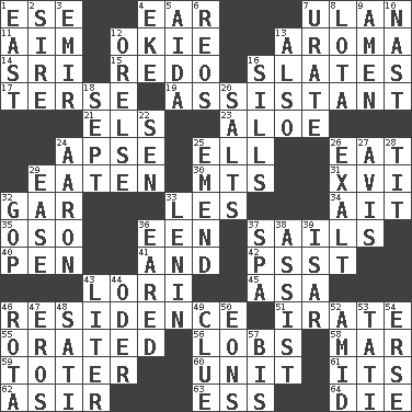 ACROSS 1. Compass dir. 4. Hearing organ 7. ____ Bator, Mongolia 11. Direct toward a target or goal 12. Migrant worker of the '30s 13. Odor 14. _ Lanka 15. Redecorate 16. Chalkboards 17. Laconic 19. Helper 21. Raised railways 23. Medicinal plant 24. Domed church section 25. Pipe bend 26. Consume 29. Consumed 30. Mountains (abbr.) 31. 16 32. Slender fish 33. French article 34. Small island 35. Bear (Spanish) 36. Car or cant ending 37. Moves on water 40. Animal enclosure 41. Also 42. Inconspicuous attention getter 43. Australian parrot (variant) 45. White ___ sheet 46. Dwelling 51. Feeling or showing extreme anger 55. Declaimed 56. Tennis shots 58. Make imperfect 59. Carrier 60. A single undivided whole 61. It is 62. SW Saudi Arabia district 63. Curvy letter 64. Expire DOWN 1. Compass direction 2. The founder of a family 3. Independent ruler or chieftain 4. Make supply last 5. Opera by Verdi 6. Vintage cars 7. A salt of uric acid 8. Globular water bottle used in Asia 9. So be it 10. Political cartoonist Thomas 12. Threatening words 13. In addition 16. Beverly of Met fame 18. Back-to-school mo. 20. Table seasonings 22. Elected rep. 24. Composer Copland 25. Make improvements or corrections to 26. Glorify 27. Opinion 28. Teat (slang) 29. Relaxation 32. Republican Party 33. Soviet premier 1918-24 36. Having ears or earlike features 37. Health resort 38. Aid 39. Austrian river, tributary to the Danube 43. 61 cubic inches 44. River in Europe 46. Round or rotation of duties 47. Greek god of love 48. Suttee (variant) 49. A slight indication 50. Immeasurably long periods of time 52. Among 53. Jacques of French films 54. Celtic language 57. Twice