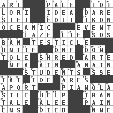 ACROSS 1. Nonscientific branch of learning 4. Diluted with white 8. Small child 11. Australian parrot (variant) 13. The main thing one is thinking about 14. Have the gumption 15. Proofreading order 16. Prepare for publication 17. Picture 18. Pertaining to the sea 21. Incident 22. Goldbrick 23. Falsehood 25. Distress signal 26. Forbid 29. A testis 32. Join together 34. Single 35. Spanish title 38. Lacquered or enameled metalware 39. Fragment 41. Johnson of "Laugh-In" 43. Teachers' org. 44. Direct toward a target or goal 45. With great haste 46. SAT takers 50. Compass dir. 51. Make lace 54. Binary compound 55. Ancient Greek god of war 57. To the left, to Queeg 59. Player piano 63. Filth; sediment 64. Aid 67. SW Asia republic 68. Story 69. Toward shelter 70. Ache 71. Followers of ems 72. Passed on 73. Compass dir. DOWN 1. In addition 2. College mil. group 3. Relationship diagram 4. Components 5. Find the sum of 6. Flowery wreath 7. Consume 8. Receives possession of 9. U. of Maine site 10. Portable shelters 12. Slanted text style (abbr.) 14. HTML Container Element 19. Nathan's nickname 20. Ending with capital 21. Snakelike fish 23. Actor's bit 24. On the rocks 26. Yet 27. At once, immediately (arch.) 28. Mediterranean tributary 30. Singer Mel 31. Dutch treat 33. Afternoon social gatherings 36. Mouths or openings 37. Nuclear Threat Initiatives 39. Saudi Arabian king (1953-1964) 40. Flintstone garb 42. Compass dir. 45. Toward the sea 47. Teat (slang) 48. Slept 49. Three (prefix) 51. Clothes sense 52. Bee-related 53. For Whom the Bell _____ 56. Clip 58. To separate or throw off 60. Northwest Algerian city 61. (Had) reclined 62. Singer Murray 64. Possessed 65. Connecticut Ivy Leaguer 66. Area sheltered from the wind
