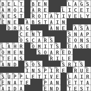 ACROSS 1. Waist strap 5. Benjamin's nick name 8. Falls behind 12. Mine, in Marseilles 13. "We ___ not amused" (Victoria) 14. It is permitted: Lat. 15. Egg locale 16. Rotating or pertaining to rotation 19. Compass dir. 20. Refrain by choice 21. To trail on the ground 23. One (Scot) 24. White ___ sheet 27. Penny 30. Fastener 31. Motion picture awards 34. Immeasurably long periods of time 35. Cowardly lion portrayer 38. Leaves out 40. Relaxation 41. Sign of something about to happen 42. Flew 44. Beverages made from leaves 45. Cause heat under the collar 46. Added to 47. Mayday 50. Indian titles of respect 53. Stimulate to action 57. Regret 59. Supplementary 63. Den 64. Maternal 65. Baking dish 66. Singer James 67. Opera by Verdi 68. Conclude 69. Trial DOWN 1. Object of repulsion 2. Make improvements or corrections to 3. Failure 4. Teat (slang) 5. Sharp remark 6. Greek god of love 7. Remaining after all deductions 8. 54 in ancient Rome 9. Adept person 10. Set 11. Filthy place 14. Actor's bit 17. American Automobile Association (abbr.) 18. Shallow baking pan 20. Eras 22. Oak nuts 24. Small Philippine buffalo 25. Without 26. Domed church section 28. Non-commissioned officer (abbr.) 29. Scottish caps 30. Sowing specialist 32. River (Sp.) 33. Play the lead 35. Globular water bottle used in Asia 36. So be it 37. Froth on beer 39. Indian title of respect (Mr.) 43. Otherwise 47. Filth; sediment 48. Single 49. Fast jet (abbr.) 51. Feeling or showing extreme anger 52. Sets or collections 54. Corncob 55. "Terrible" tsar 56. Tear apart 58. Part of Q.E.F. 59. Ocean 60. Single; one (prefix) 61. Writing tablet 62. Parent Teacher Association (abbr.) 63. Allow