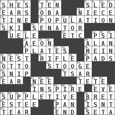 ACROSS 1. "______ My Girl" (Turtles hit) 5. Nine, plus one 8. Downhill vehicle 12. Hearing organs 13. Chief or king in Benin or Nigeria 14. Sibling's daughter 15. Prong on a fork 16. Census information 19. What Jean-Claude Killy likes to do 20. Elected representative 21. Ubangi River tributary 23. And so on (abbr.) 24. 23rd letter of the Greek alphabet 27. Age 30. Actor Alda or Thicke 31. Food holders 34. Count _ (2 wds.) 35. A home for chicks 38. Ransack; plunder; pillage 40. Groovy apts. 41. Von Bismarck 42. Moe Howard, for one 44. Sever or remove by pinching or nipping 45. Russian ruler of old 46. Ewer handle 47. Born 50. False hair 53. Heighten or intensify 57. Night before a holiday 59. Supplementary 63. Cy Young winner Saberhagen 64. First name in cosmetics 65. Baking dish 66. Is not 67. Rend 68. Conclusion 69. Stalk of a moss capsule DOWN 1. Puts into a specified state 2. Japanese poetic form 3. Bert's buddy 4. Compass dir. 5. Drink excessively 6. Inky black, to poets 7. California wine valley 8. Be seated 9. Flowery wreath 10. Environmental prefix 11. Lair 14. Drug cop 17. Shoshoni 18. Car dealer's back yard 20. Stitch closed the eyes of (a falcon) 22. Portable computer 24. Entreaty 25. Expressed in words 26. Restaurants 28. Rowing implement 29. Nuclear Threat Initiatives 30. Electrical Unit 32. Lizard (obsolete) 33. Narrow opening 35. Characteristic smell of wine 36. Inactive volcano in Sicily 37. Disorderly outburst 39. Greek goddess of the dawn 43. Yard entry 47. Mediterranean tributary 48. Compass dir. 49. Eastern Standard Time (abbr.) 51. Laconic 52. Happening 54. Corncob 55. _ the terrible 56. Tear apart 58. Singer James 59. Put into a specified state 60. Purpose 61. Parent Teacher Assoc. 62. For each 63. Altar cloth linen