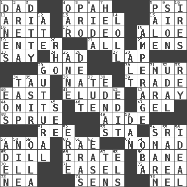 ACROSS 1. Male parent 4. Brightly colored fish 8. Air pressure measure (abbr.) 11. Operatic vocal solo 13. Satellite of Uranus 15. Atmosphere 16. Remaining after all deductions 17. Cowboy competition 18. Medicinal plant 19. Keyboard key 21. Everything 22. Not women's 23. Declare 24. Possessed 27. Infant locale 29. Went 30. Arboreal primate 34. The 19th letter of the Greek alphabet 36. Nathan's nickname 39. Exchange 40. 90 degrees 41. Dodge 43. Like ___ of sunshine 44. Leaves out 46. Watch over 47. Set 48. Upset 49. Helper 51. To riddle 53. R.R. building 54. Indian title of respect (Mr.) 57. Small Philippine buffalo 60. Actress Charlotte 63. Wanderer 65. Deli pickle 66. Feeling or showing extreme anger 69. Object of repulsion 70. Pipe bend 71. Artist's stand 72. Type of rug 73. Teachers' org. 74. Elected reps. 75. Cartoonist voice _ Blanc DOWN 1. Natives or inhabitants of Denmark 2. Sports stadium 3. Short, simple song 4. Boat paddle 5. Adept person 6. Opera by Verdi 7. The bottom of a shoe or boot 8. Light colored 9. The Jewish people; Israel 10. Angers 12. Had dinner 14. Hang loosely or laxly 18. Electrical Measurement 20. 17th letter of the Greek alphabet 25. Queen of England 1702-14 26. Started a card game 28. The first octave above the treble staff 29. From the throat 31. Female horse 32. Hereditary estate 33. Marina Del _, California 34. Pack (down) 35. SW Saudi Arabia district 37. Third day of the wk. 38. Ferber et al. 40. Greek goddess of the dawn 42. Prepare for publication 45. Observe 50. Daniel's nick name 52. One of the Great Lakes 54. Excessive but superficial compliments 55. The wife of a rajah (variant) 56. Perfect 57. An important port of Yemen 58. Mediterranean tributary 59. Water jar 61. Ancient river in northeast Turkey 62. Relaxation 64. Chief or king in Benin or Nigeria 67. "___ Little Indians" 68. Raised railways