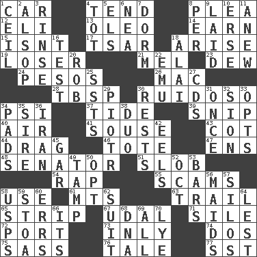 ACROSS 1. 4-wheeled motor vehicle 4. Look after 8. Entreaty 12. Biblical high priest 13. Margarine 14. Merit 15. Is not 17. Russian ruler of old 18. Originate 19. Failure 21. Cartoonist voice _ Blanc 23. Morning condensation 24. Mexican monetary units 26. Apple computer (short form) 28. Cook's measure (abbr.) 30. Boisterous (Brazilian Portuguese) 34. 23rd letter of the Greek alphabet 37. Event that recurs at intervals 39. Clip 40. Wind 41. Lush 43. Small bed 44. To draw with force 46. Haul 47. Followers of ems 48. Legislator 51. Messy guy 54. Reproach for some lapse or misdeed 55. Fraudulent business schemes 58. Purpose 61. Mountains (abbr.) 63. Hang back 65. Remove all contents or possession from 67. Freehold land 71. Drop; flow; fall 72. Sweet dark-red dessert wine 73. Inwardly 74. Two (Sp.) 75. Backtalk 76. Falsehood 77. Fast jet (abbr.) DOWN 1. To provide with a ceiling 2. Columnist Joseph or Stewart 3. Wash lightly 4. Small child 5. Raised railways 6. Teachers' org. 7. Dormintory (informal) 8. For each 9. Put down 10. Celtic language 11. Afresh 16. Trial 18. Jai ____ 20. Director Reiner 22. Australian flightless bird 25. Fast planes 27. Music discs 29. Peter (Polish) 30. Musical pauses 31. Single time 32. The Jewish people; Israel 33. Chooses 34. Groovy apts. 35. Beget 36. SW Asia republic 38. Superhero pair 42. Snakelike fish 45. Slender fish 49. Pack (down) 50. Choose 52. Sep. follower 53. Taverns 56. Women servants 57. Grain storage towers 58. United States Postal Service (abbr.) 59. Portico 60. Blunders 62. Set of matching outer garments 64. For fear that 66. ___ a Wonderful Life 68. Heredity factor (abbr.) 69. Everything 70. Sodium hydroxide