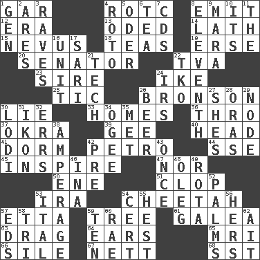 ACROSS 1. Slender fish 4. College mil. group 8. Give off 12. Period 13. Wrote a lyric poem 14. Thin strip of wood or metal 15. Congenital growth or mark on the skin 18. Afternoon social gatherings 19. Celtic language 20. Elected representative 22. Federal power corp. 23. Title for a man of rank and authority 24. Mamie's husband 25. Nervous spasm 26. "Death Wish" actor 30. Whopper 33. Dwellings 36. Through, poetically 37. Gumbo ingredient 39. Turn to the right 40. Froth on beer 41. Dormintory (informal) 42. Stone: prefix 44. Compass dir. 45. Heighten or intensify 47. Not either 50. Compass dir. 51. Hoof sound 53. Retirement account (abbr.) 54. Leopard's kin 57. Singer James 59. Relationship diagram 61. An organ shaped like a helmet 63. To draw with force 64. Hearing organs 65. Medical imaging device (abbr.) 66. Filth; sediment 67. Remaining after all deductions 68. Fast jet (abbr.) DOWN 1. Commissioned military rank (abbr.) 2. Ancient Greek god of war 3. All-night dance parties 4. Printing process, for short 5. River in Europe 6. Afternoon social gathering 7. Music discs 8. Veterans Day date 9. Hindu Mythology: god of death 10. It is 11. Definite Article 16. A single undivided whole 17. Indian skirt 21. Technology 22. Ring climax 24. Big collection agency 26. Fermented drink made from hops 27. "______ My Girl" (Turtles hit) 28. Mouths or openings 29. Connecting point 30. Farming town in central California 31. Visual representation of an object 32. Blunders 34. Double curve, resembling the letter S 35. Was introduced to 38. Electrical Measurement 42. Before (prefix) 43. Single time 46. _ tizzy (2 wds.) 48. Cassini of fashion 49. Roll call or roster of names 52. Insides of hands 53. Slanted text style (abbr.) 54. An absolute certainty 55. Command 56. Possessive pronoun 57. Begley and Asner 58. Three (prefix) 59. "___ Little Indians" 60. Actress Charlotte 62. Small island