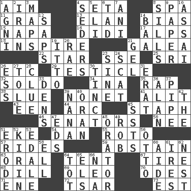 ACROSS 1. Direct toward a target or goal 4. Stalk of a moss capsule 8. Health resort 11. Pate de foie ____ 13. Style 14. Prejudice 15. California wine valley 16. "You Light Up My Life" star Conn 17. High mountains 18. Heighten or intensify 21. An organ shaped like a helmet 22. Play the lead 23. Compass dir. 25. _ Lanka 26. And so on (abbr.) 29. One of the two male reproductive glands 32. Twentieth part of a lira 34. _ tizzy (2 wds.) 35. Reproach for some lapse or misdeed 38. Change direction abruptly 39. Music written for nine 41. Came down and settled, as after flight 43. Car or cant ending 44. Curve 45. Staphylococcus 46. Elected representatives 50. Born 51. Supplement with great effort 54. One of the 12 tribes of Israel 55. Printing process, for short 57. Amusement-park features 59. Refrain by choice 63. Taken by mouth 64. Portable shelter 67. Become fatigued 68. Deli pickle 69. Margarine 70. Lyric poems 71. Compass dir. 72. Russian ruler of old 73. Eastern Standard Time (abbr.) DOWN 1. Hindu god of fire 2. SW Asia republic 3. Atlas contents 4. Spring feasts 5. Connecticut Ivy Leaguer 6. Small amount or degree 7. Cuckoo 8. Beverly of Met fame 9. Some stationery 10. Slender Brazilian palm 12. Plant excrements 14. Sound made by sheep 19. "Tell ____ the Marines!" 20. Actress Charlotte 21. Set 23. Trig term 24. Get outta here! 26. Curvy letter 27. Lacquered or enameled metalware 28. A slight indication 30. Tinged 31. Part of Q.E.F. 33. Habitations of wild animals 36. Actor Alda or Thicke 37. Corncob 39. Grandmother 40. Northwest Algerian city 42. Definite Article 45. Fast planes 47. Begley and Asner 48. Speaker 49. Director Reiner 51. Wear away 52. Japanese brewing company 53. Peak District village in England 56. Von Bismarck 58. Pipe bend 60. Assistant 61. Angers 62. A home for chicks 64. Small child 65. Raised railways 66. Teachers' org.