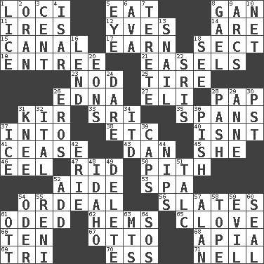 ACROSS 1. Venues 5. Consume 8. Separate the seeds from cotton 11. Angers 12. Jacques Cousteau's middle name 14. "We ___ not amused" (Victoria) 15. Lessep's creation 17. Merit 18. Religious group 19. Main course 21. Artist's stands 23. Lower and raise head in agreement 25. Hoop that covers a wheel 26. Pulitzer Prize-winning author Ferber 27. Biblical high priest 28. Infant food 31. Apertif with cassis 33. Indian title of respect (Mr.) 35. Connects, as a bridge 37. To the inside or interior of 38. And so on (abbr.) 40. Is not 41. Desist 43. Daniel's nick name 45. A female animal or person 46. Snakelike fish 47. To free from 50. Heart or essence 52. Helper 53. Health resort 54. Severe or trying experience 56. Chalkboards 61. Wrote a lyric poem 62. Equivocates 65. Garlic unit 66. Nine, plus one 67. "Beetle Bailey" pooch 68. Capital of Western Samoa 69. Three (prefix) 70. Curvy letter 71. 1994 drama film starring Jodie Foster DOWN 1. Louse (plural) 2. NW Algerian seaport 3. Penny 4. Austrian river, tributary to the Danube 5. Sight organ 6. Actress Gardner 7. Cylindrical with tapered ends 8. Highlander 9. Curves 10. Fish or hair follower 13. Slow-paced one 16. Grant temporary use of 18. Perceive with the eye 20. Immeasurably long periods of time 22. Indian titles of respect 24. Have the gumption 26. Greek god of love 28. Romantic infatuation 29. Queen of England 1702-14 30. Pacific Standard Time (abbr.) 31. Leg joint 32. Slanted text style (abbr.) 34. It would 36. Expression of disdain 37. Frozen water 39. Smile enhancers 42. One of the Great Lakes 44. Pinches, bites 48. Potato state 49. Erase 51. Baby powder 52. Increase 54. River in Europe 55. Painter Guido (1575-1642) 57. ____ Jay Lerner 58. Drink excessively 59. Morally bad or wrong 60. Lick closed 61. Baseball player Mel 63. Mountains (abbr.) 64. Mayday