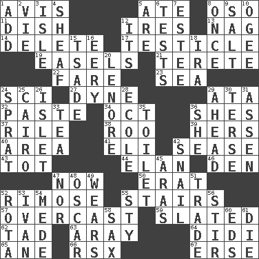 ACROSS 1. Advice 5. Had dinner 8. Bear (Spanish) 11. Food container 12. Angers 13. Tired old horse 14. Erase 17. One of the two male reproductive glands 19. Artist's stands 21. Cigar-shaped 22. Conductor's collection 23. Ocean 24. _-fi 27. Unit of force 29. _ moment's notice (2 wds.) 32. Thick mixture 34. Sep. follower 36. "______ My Girl" (Turtles hit) 37. Cause heat under the collar 38. Friend of Pooh 39. Possessive pronoun 40. Type of rug 41. Connecticut Ivy Leaguer 42. Gospel singer Marvin 43. Small child 44. Flair 46. Lair 47. Immediately 50. Part of Q.E.F. 52. Full of chinks, cracks, or crevices 55. Flight of steps 57. Cloudy 59. Scheduled 62. Bit 63. Like ___ of sunshine 64. "You Light Up My Life" star Conn 65. A saturated hydrocarbon 66. Acura sports coupe 67. Celtic language DOWN 1. Find the sum of 2. Compete 3. Capri or Wright 4. To gather and bind into a bundle 5. "We ___ not amused" (Victoria) 6. Trials 7. First name in cosmetics 8. At one time in the past 9. Table seasoning 10. Double curve, resembling the letter S 12. ___ a Wonderful Life 15. Sadhe (variant) 16. Suggestive of the supernatural 18. Retirement account (abbr.) 20. Poe poem 24. Small fatty European fish 25. Capital of Egypt 26. Small island 28. Learning spot: Fr. 29. Toward the future 30. Laconic 31. NE Netherlands city 33. Beverage made from leaves 35. Bathroom 36. A female animal or person 42. Slow-paced one 45. Ancient river in northeast Turkey 47. Not either 48. Motion picture award 49. Erodes 51. Barter 52. Round or rotation of duties 53. _ the terrible 54. Ancient Persian 55. Filthy place 56. Agitate 58. Saxophone 60. Begley and Asner 61. Pass on
