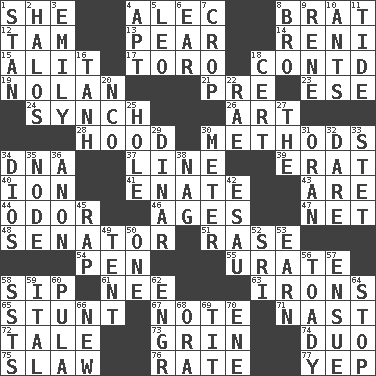 ACROSS 1. A female animal or person 4. Actor Baldwin 8. Naughty child 12. Scottish cap 13. Lightbulb-shaped fruit 14. Painter Guido (1575-1642) 15. Came down and settled, as after flight 17. "Corrida" creature 18. Continued (abbr.) 19. Pitcher Ryan 21. Before (prefix) 23. Compass dir. 24. Synchronize (abbr.) 26. Tate display 28. Parka part 30. Modes 34. Heredity factor (abbr.) 37. Actor's bit 39. Part of Q.E.F. 40. Electrically charged atom 41. Related on the mother's side 43. "We ___ not amused" (Victoria) 44. Aroma 46. Ripens 47. Fish or hair follower 48. Elected representative 51. Raze (variant) 54. Animal enclosure 55. A salt of uric acid 58. Small drink 61. Born 63. Removes the wrinkles 65. Check the growth or development of 67. Brief written record 71. Political cartoonist Thomas 72. Lie 73. Smile widely 74. Superhero pair 75. Cole _ (cabbage dish) 76. Assign a rank or rating to 77. Slangy assent DOWN 1. Comedian Laurel of Laurel & Hardy 2. Rings 3. Poet Dickinson 4. Fitting 5. Lion 6. Hearing organ 7. Riding implement 8. Sis' sibling 9. French philosopher Descartes 10. Pismires 11. Periodic rise and fall of the sea level 16. Hyperbolic tangent 18. Sure thing 20. Non-commissioned officer (abbr.) 22. Actress Charlotte 25. Opening into or through something 27. Definite Article 29. Middle Eastern gold or silver currency 30. Distance measurement 31. Northwest Algerian city 32. Have the gumption 33. Proofreading order 34. "Vaya con ____" 35. Thickened enlargement 36. At once, immediately (arch.) 38. Tired old horse 42. Son of Isaac 45. Hit sharply and swiftly 49. Portable shelter 50. Single 52. _ Lanka 53. Merit 56. Sycophant 57. Follow as a consequence or result 58. Fast planes 59. Slanted text style (abbr.) 60. Monetary unit of Botswana 62. Engineer (abbr.) 64. Constrict 66. ___ Haven, CT 68. Mouth or opening 69. Teat (slang) 70. Compass dir.