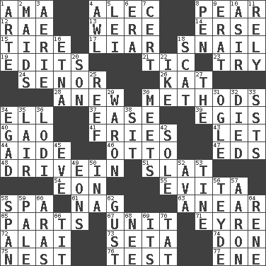 ACROSS 1. Nursemaid (var.) 4. Actor Baldwin 8. Lightbulb-shaped fruit 12. Actress Charlotte 13. We are 14. Celtic language 15. Become fatigued 17. One who doesn't tell the truth 18. Slow-paced one 19. Prepares for publication 21. Nervous spasm 23. Attempt 24. Sir (Sp.) 26. Krazy ___ of comics 28. Afresh 30. Modes 34. Pipe bend 37. Comfort 39. Armor plate that protects the chest 40. E Mali city 41. Strips of potato fried in deep fat 43. Allow 44. Assistant 46. Von Bismarck 47. Begley and Asner 48. Popular '50s hangout 51. Narrow board 54. Period of immesurable duration 55. Webber/Rice musical 58. Health resort 61. Tired old horse 63. Approach 65. Components 67. A single undivided whole 71. Jane of fiction 72. Jai ____ 73. Bristle 74. Spanish title 75. Egg locale 76. Trial 77. Compass dir. DOWN 1. Johnson of "Laugh-In" 2. Unmarried girls 3. Nest on high 4. Leather borer 5. Flowery wreath 6. Period 7. Certainty 8. Writing instrument 9. Part of Q.E.F. 10. SW Saudi Arabia district 11. Have confidence or faith in 16. Inactive volcano in Sicily 18. Go away! 20. Male child 22. Mamie's husband 25. Coral ridge 27. Definite Article 29. Make _____ (do battle with) 30. Confronts 31. Stare at amorously 32. Passed on 33. Fast planes 34. Mild oath 35. Den 36. Farming town in central California 38. Be seated 42. Not divided or shared with others 45. First lady 49. Immeasurably long periods of time 50. _ tizzy (2 wds.) 52. Actress Gardner 53. Prong on a fork 56. Miss Universe 1986, Barbara Palacios _ 57. Composer Copland 58. Connect, as a bridge 59. Diluted with white 60. Caspian sea tributary 62. Abrupt rush of wind 64. French philosopher Descartes 66. Teat (slang) 68. Born 69. ___ a Wonderful Life 70. Make lace