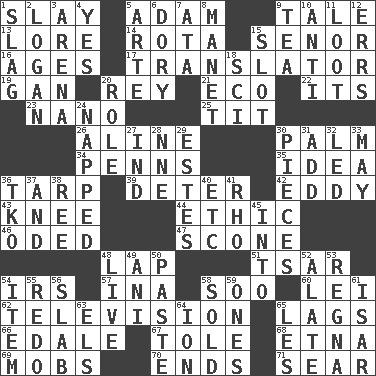 ACROSS 1. Kill 5. First of billions? 9. Falsehood 13. Old wives' tales, e.g. 14. Roll call or roster of names 15. Sir (Sp.) 16. Eons 17. Interpreter 19. Separate the seeds from cotton 20. Marina Del _, California 21. Environmental prefix 22. It is 23. Billionth: prefix 25. Teat (slang) 26. Place in a line 30. Inside of hand 34. Actor Sean's family 35. The content of cognition 36. Canvas cover 39. Prevent from occurring 42. Whirlpool 43. Leg joint 44. Value system 46. Wrote a lyric poem 47. Biscuitlike quick bread 48. Infant locale 51. Russian ruler of old 54. Big collection agency 57. _ tizzy (2 wds.) 58. "Barney Miller" actor Jack 60. Flowery wreath 62. Boob tube 65. Falls behind 66. Peak District village in England 67. Lacquered or enameled metalware 68. Inactive volcano in Sicily 69. Crowds into 70. Extremities 71. Shrivel DOWN 1. Volcanic refuse 2. Utah city north of Ogden 3. Sports stadium 4. It is so 5. Johnson of "Laugh-In" 6. Rowboat 7. "One Day ___ Time" 8. French painter Edouard 9. Afternoon social gathering 10. Opposed to 11. Spoils 12. Blunders 15. Narrow opening 18. _-fi 20. Hero or heavy, e.g. 24. Slept 27. Indiana (abbr.) 28. Compass dir. 29. _____ Park, CO 30. Components 31. Say or write further 32. Directed 33. Fifth month 36. Ring climax 37. Plus 38. To separate or throw off 40. And so on (abbr.) 41. 17th letter of the Greek alphabet 45. To the inside or interior of 48. Not recorded 49. Cuckoo 50. Thick mixture 52. Having winglike extensions 53. Canadian anthropologist Darnell 54. A whole individual unit 55. Redecorate 56. Broad, flat, thick piece 58. Exchanged or delivered for money 59. Singles 61. Austrian river, tributary to the Danube 63. Raised railways 64. Electrically charged atom 65. French article
