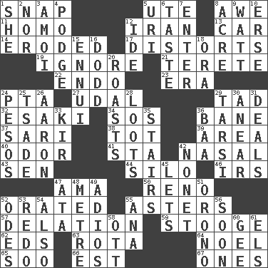 ACROSS 1. Fastener 5. Shoshoni 8. Deep reverence 11. Like (prefix) 12. SW Asia republic 13. Auto 14. Worn away 17. What propaganda does 19. Refuse to acknowledge 21. Cylindrical with tapered ends 22. Inside; within (prefix) 23. Epoch 24. Parent Teacher Association (abbr.) 27. Hereditary estate 29. Small amount or degree 32. 1973 Nobel Price Winner (Physics) Leo 34. Mayday 36. Object of repulsion 37. Indian skirt 38. Small child 39. Type of rug 40. Aroma 41. R.R. building 42. Rhinal 43. Elected rep. 44. Grain storage tower 46. Big collection agency 47. Housemaid (var.) 50. Former U.S. Attorney General Janet 52. Spoke pompously 55. Michaelmas daisies 57. Accusation by an informer 59. Moe Howard, for one 62. Begley and Asner 63. Roll call or roster of names 64. Christmas carol 65. "Barney Miller" actor Jack 66. Eastern Standard Time (abbr.) 67. Singles DOWN 1. A female animal or person 2. And not 3. Mine, in Marseilles 4. Plash 5. RI univ. 6. Clothes sense 7. Keyboard key 8. Land measure 9. Electrical Unit 10. Celtic language 12. Binary compound 15. World-weariness 16. Texas town _ City 18. Mouth or opening 20. Cooks with dry heat, as in an oven 24. Mexican monetary units 25. Sadhe (variant) 26. Composer Copland 28. Plunders 29. Tarsus (plural) 30. Approach 31. Allots cards 33. Apertif with cassis 35. Flight of steps 36. Sound made by sheep 42. Music written for nine 45. Allows 47. _ moment's notice (2 wds.) 48. Distance measurement (Brit.) 49. Goodbye (Sp.) 51. U. of Maine site 52. Lyric poems 53. Do over again 54. In addition 55. Santa ___, CA 56. Within a short period 58. Baseball player Mel 60. Unit of force equal to gravity 61. Raised railways