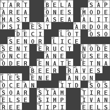 ACROSS 1. Small pie 5. Actor Lugosi 9. Plant excrement 12. Type of rug 13. Singles 14. Method 15. Vertical spar for supporting sails 16. Toward the sea 17. Set down 18. Air pressure measure (abbr.) 19. Eastern Standard Time (abbr.) 21. Zeal 22. Tenth: prefix 24. Car dealer's back yard 26. Bear (Spanish) 27. Sir (Sp.) 28. Louse (plural) 29. Emitted 30. Spew [out] 32. Thickened enlargement 36. Single time 37. A saturated hydrocarbon 38. One who uses or employs something 39. River in Europe 40. Maternal 42. Inactive volcano in Sicily 43. Fermented drink made from hops 44. All-night dance parties 46. French article 49. Compass dir. 50. At once, immediately (arch.) 51. Sea 53. It would 54. Mayday 57. Fly high 58. Thailand, formerly 61. Hoop that covers a wheel 62. Otherwise 63. Simple or foolish person 64. "Terrible" tsar 65. To sift 66. Native american tent (variation) 67. Snakelike fish DOWN 1. Pack (down) 2. Ancient river in northeast Turkey 3. Home 4. Make lace 5. Water vessel 6. Followers of ems 7. Area sheltered from the wind 8. White ___ sheet 9. Twentieth part of a lira 10. Goodbye (Sp.) 11. Stone: prefix 14. Third mo. 19. Environmental prefix 20. Beget 21. Had dinner 23. Keyboard key 24. It is permitted: Lat. 25. Sep. follower 27. Transmit 28. Type of eclipse 29. "Barney Miller" actor Jack 31. The wife of a rajah (variant) 32. New (sp.) 33. Clearly or manifestly demonstrative 34. Hiding places for outlaws 35. Period 40. Car or cant ending 41. Part of Q.E.F. 43. Benjamin's nick name 45. Plus 46. Failure 47. Learning spot: Fr. 48. Gospel singer Marvin 52. "We ___ not amused" (Victoria) 53. Body of Kaffir warriors 55. Of the mouth 56. Elected reps. 58. Fast jet (abbr.) 59. One more than two 60. Electrical Unit 61. Neckwear