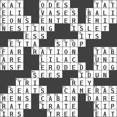 ACROSS 1. Krazy ___ of comics 4. Lyric poems 8. Make lace 11. Connecticut Ivy Leaguer 12. Flower holders 14. Indonesian resort city 15. Immeasurably long periods of time 17. Keyboard key 18. Send forth 19. Snuggling 21. Small island 23. Double-curved letter 24. ___ a Wonderful Life 25. Singer James 27. Halt 30. At a great distance 31. Food allowance for one day 34. Keyboard key 37. "We ___ not amused" (Victoria) 38. Pale purple color 39. Single; one (prefix) 40. Science/research agcy. 41. Eaten away 43. Coat; cloak 44. Observes 45. Goddess of spring and wife of Bragi 47. Three (prefix) 49. Marina Del _, California 50. Theater features 52. Devices for capturing images 56. Not women's 57. Small house or cottage 60. Have the gumption 61. Assign a rank or rating to 62. Feeling or showing extreme anger 63. Monetary unit of Laos 64. Big collection agency 65. Family _ (genealogy) 66. Erode DOWN 1. Peachy ____! 2. _ vera 3. Canisters 4. Baking chambers 5. Mild oath, euphamism for damn 6. Eastern Standard Time (abbr.) 7. Perceive with the eye 8. Makes less strong or intense 9. Set down 10. Teat (slang) 13. Indian title of respect (Mr.) 14. Waist strap 16. Proofreading order 20. Austrian river, tributary to the Danube 22. Small drink 25. Hearing organs 26. Unclean, religiously 27. Grain storage towers 28. Frog relative 29. At one time in the past 30. Avid follower 32. Toward shelter 33. Hoop that covers a wheel 34. Ballerina skirt 35. Soon (poet.) 36. Large 42. South Vietnam president (1954) 44. Be seated 46. Colored 47. Portable shelters 48. To erase 49. Indian princess (variant) 50. Dry up 51. _-fi 52. Quote 53. Libertine 54. Operatic vocal solo 55. Back-to-school mo. 56. Medical imaging device (abbr.) 58. Tate display 59. Tavern